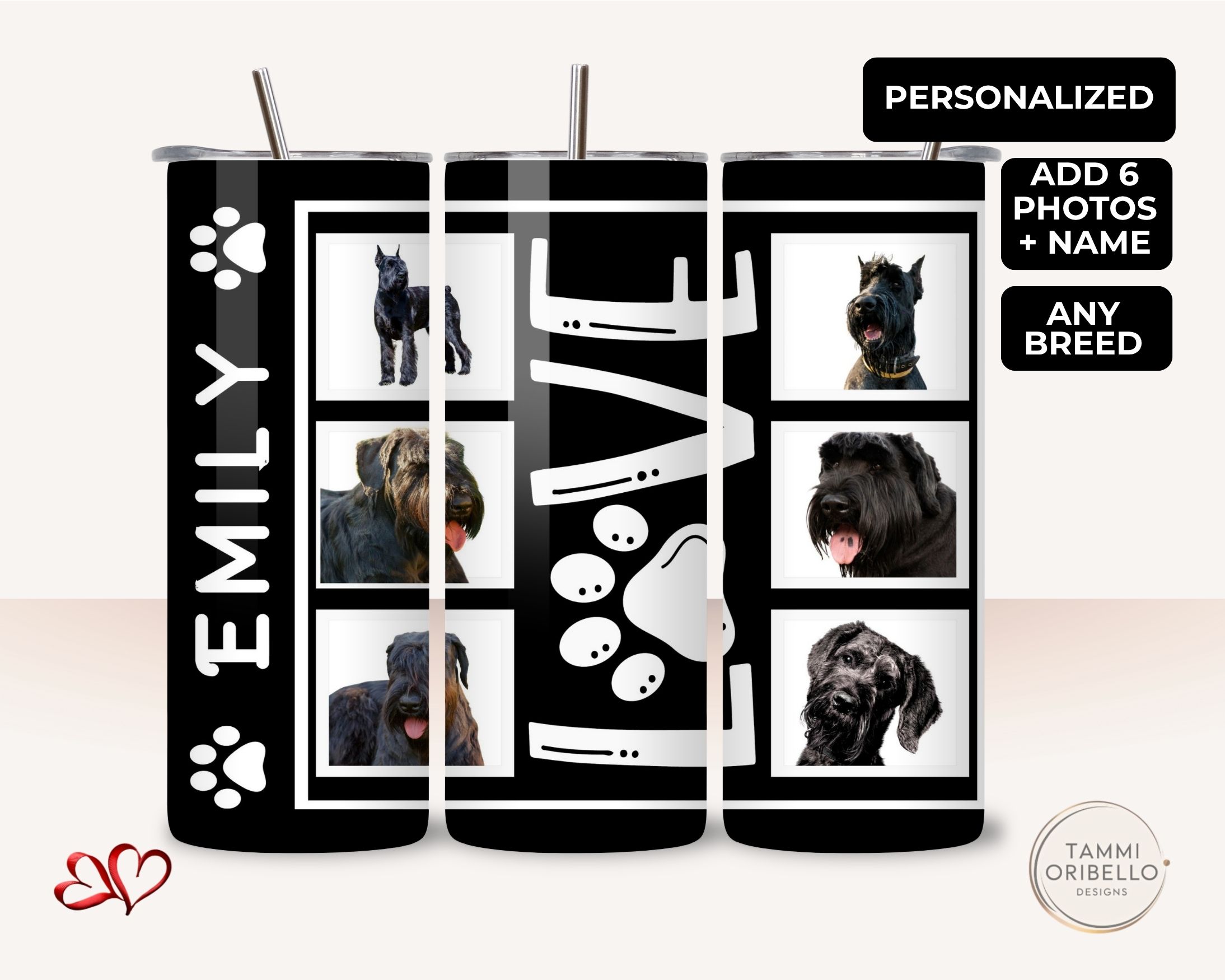 Create a custom 20 oz dog photo tumbler with six photos and a name in a bold black and white LOVE design, handcrafted by Tammi Oribello Designs in Lapeer, MI.