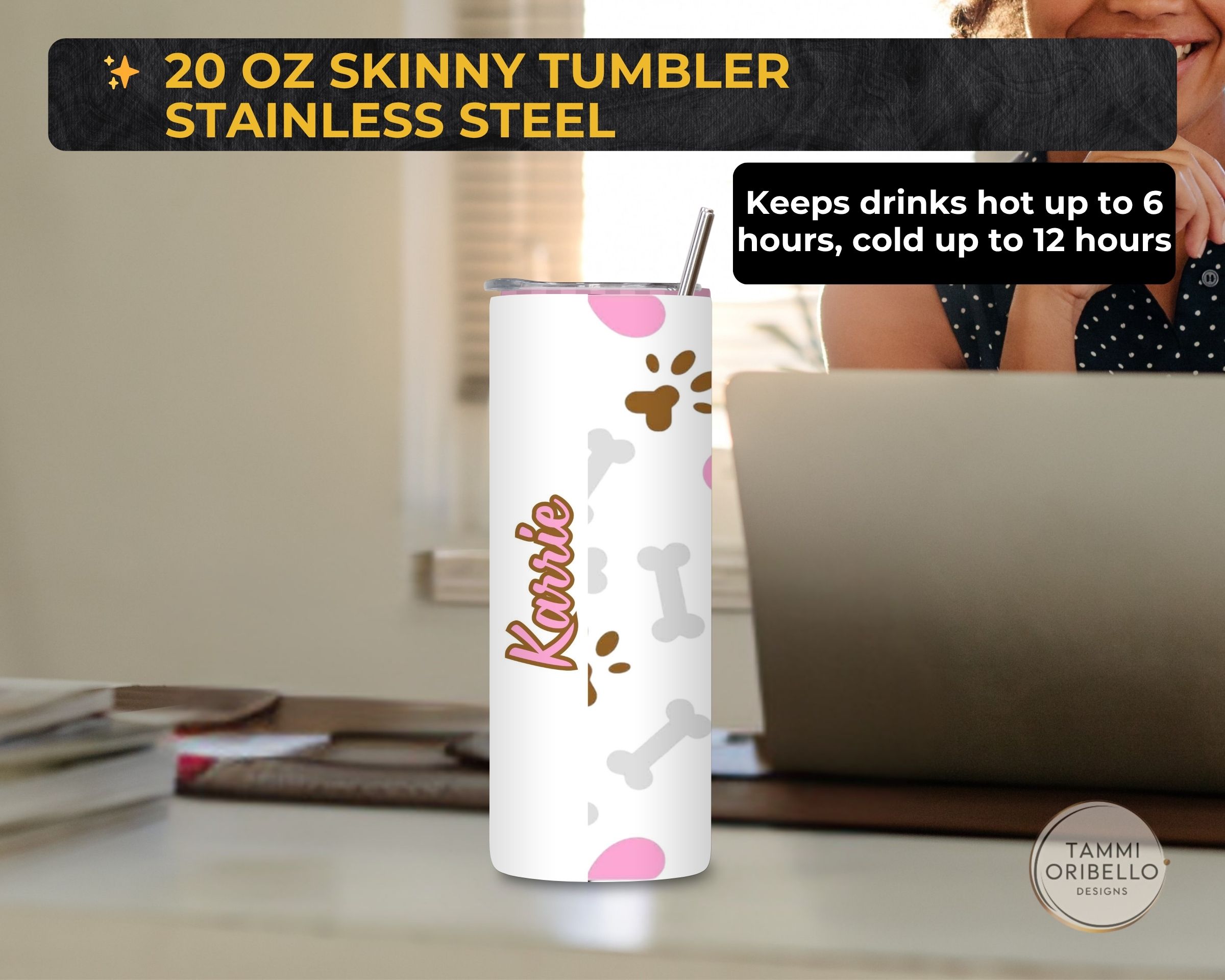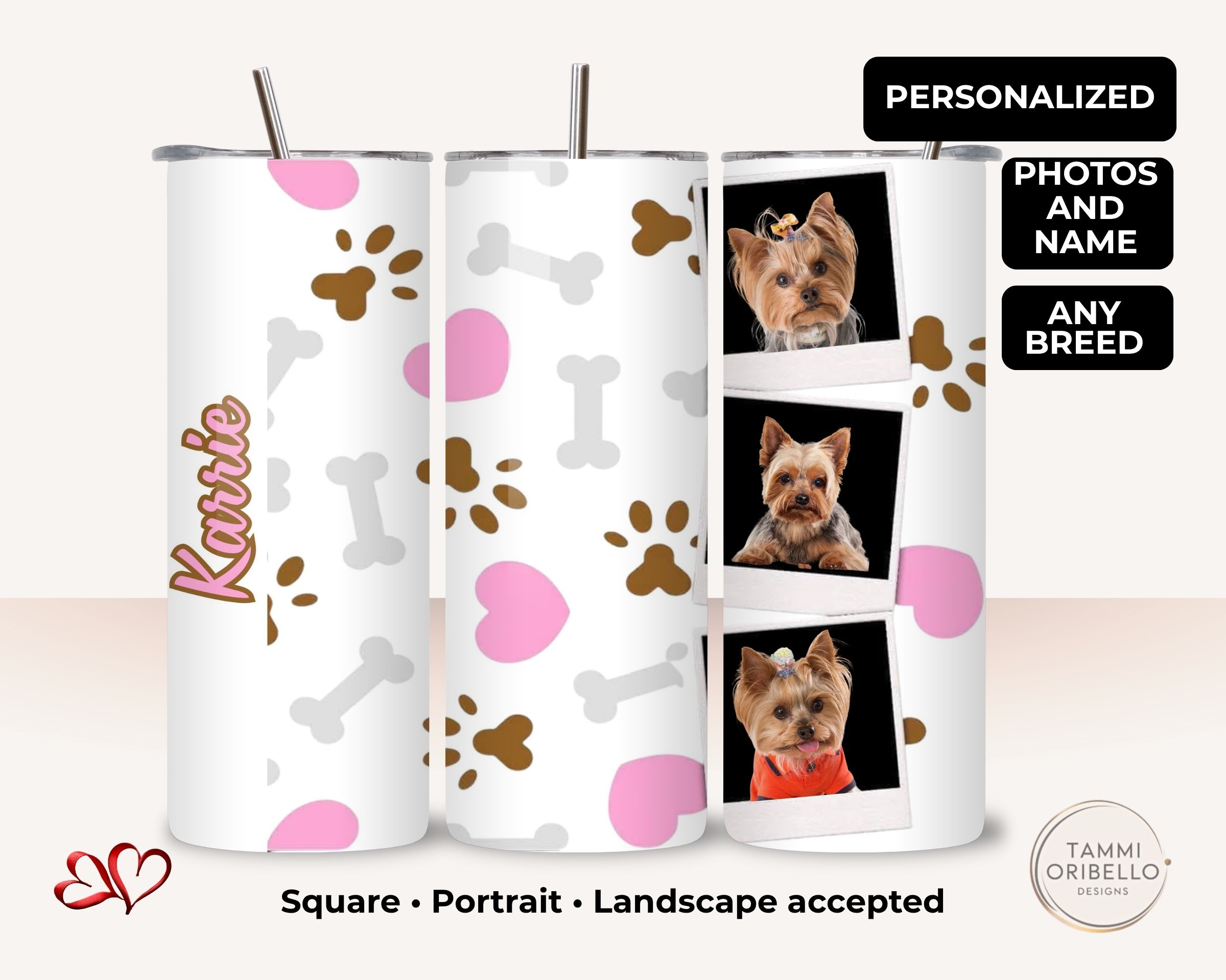 Description Your pup is family. Celebrate them every day with a tumbler that’s all theirs—and all yours. Upload three favorite photos, tell me the name, and I’ll place them in the playful paws & bones design, then sublimate the artwork permanently onto a 20-oz stainless steel cup that travels everywhere. It’s light, durable, and sized for most car cup holders. Perfect for coffee runs, dog-park walks, and gift-giving to the dog mom or dad who has everything—except this.