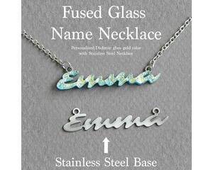 Personalized Jewelry Transform your look with our exquisite Fused Glass Pendant, a minimalist Name Necklace! In a Horizontal design. Crafted from fused dichroic glass in a stunning golden hue, this pendant is a True work of art. Using advanced technology, the pendant is combined with a sturdy 18-gauge stainless steel base, creating a unique piece that captures the incredible reflections only glass can produce while boasting stainless steel's strength and durability.