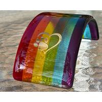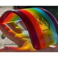 Place the glass bridge near a window and marvel as the natural sunlight illuminates your photo memorial with rainbow light passing around and through your photo memory. Provide comfort to someone who has lost a dear pet by gifting them this unique life memorial. The finished dimensions are 5.25" L x 3.125" W x 2.125" H (6mm thick glass) so it is ideal for placing on a 6" deep kitchen window sill or in a garden window. A name/title can be added to the photo image for free. There is an option to incorporate ashes and dichroic frit within the red and violet rails of the bridge (see "Tilly" photo). Submit your life memorial photo via Etsy messaging after you place your order.