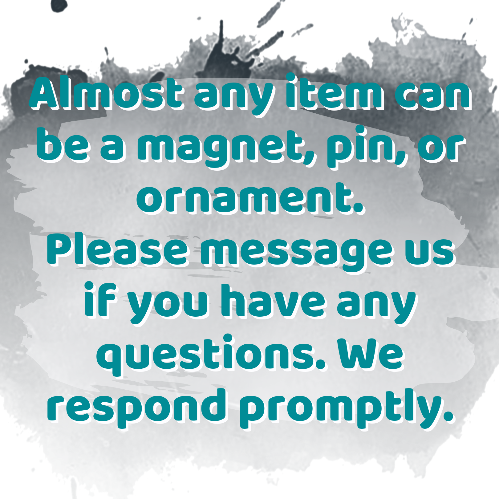 Painted with acrylic paints & a vinyl decal, amd a hemo cord. Or we can make it into an magnet.