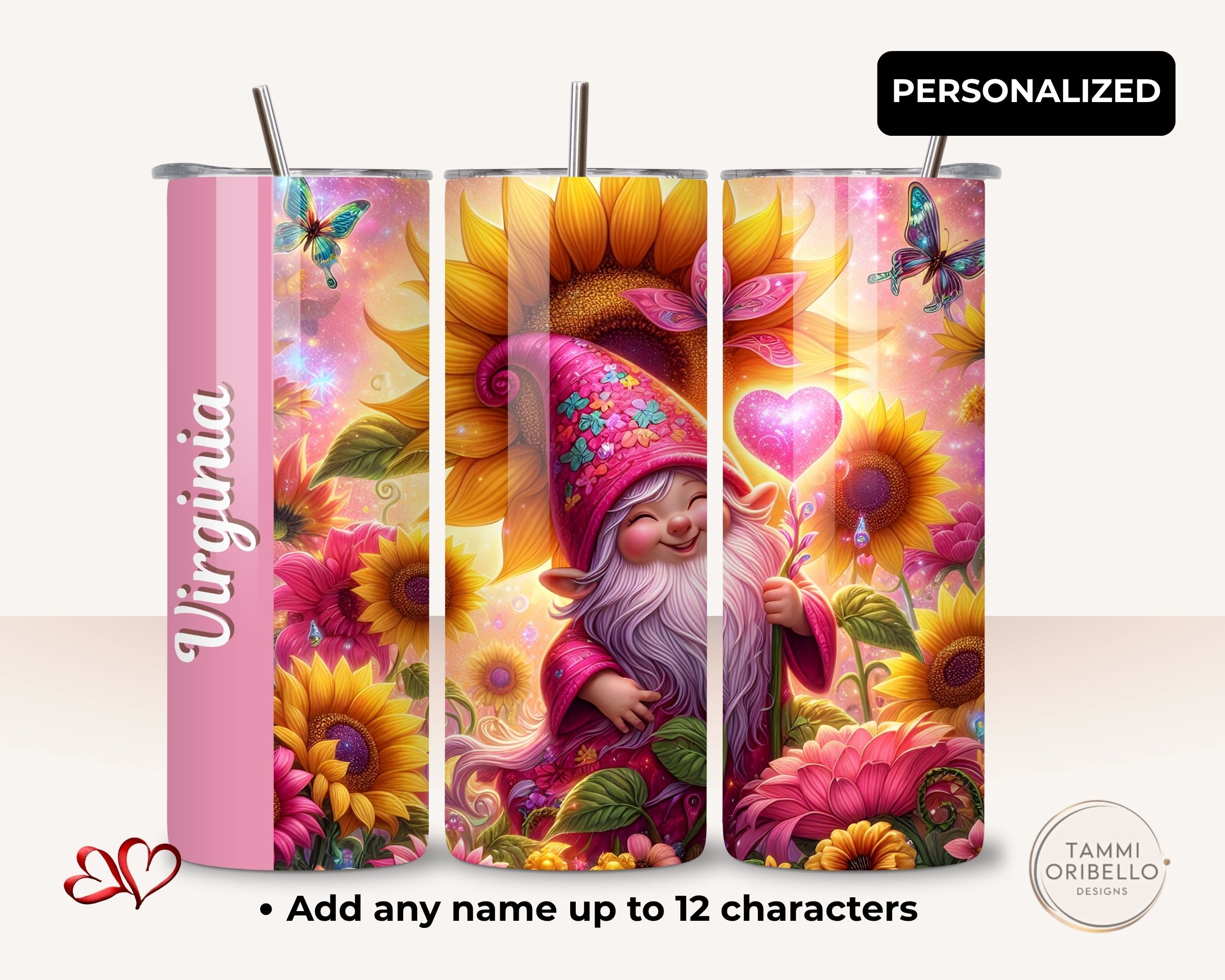 Make someone smile with a cozy, pink gnome couple holding a heart balloon—personalized with any name. This 20-oz stainless tumbler keeps drinks hot or cold and arrives gift-ready with a ribboned box. Handcrafted and shipped from Lapeer, Michigan.