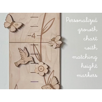 Overall dimensions of this kids height chart (not including hanging string) are approximately 11.75" x 49", and it can accommodate heights from @ 22.5"-69.5". Measurements as shown are in imperial units (inches) and this will be the default unless otherwise discussed. They can be changed to metric if desired - please message me with any questions about customizations.