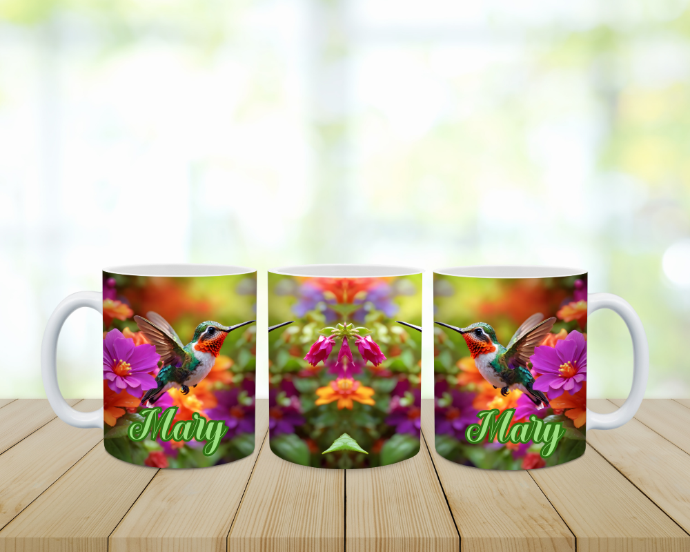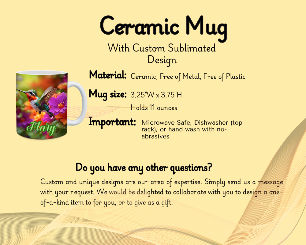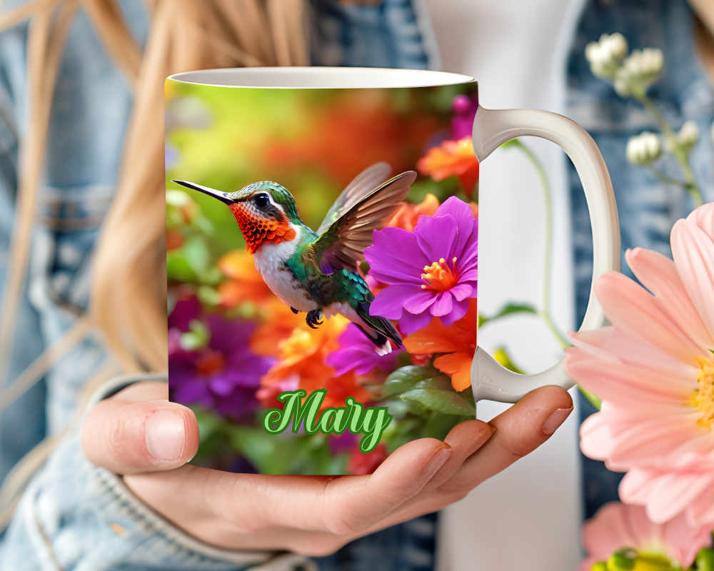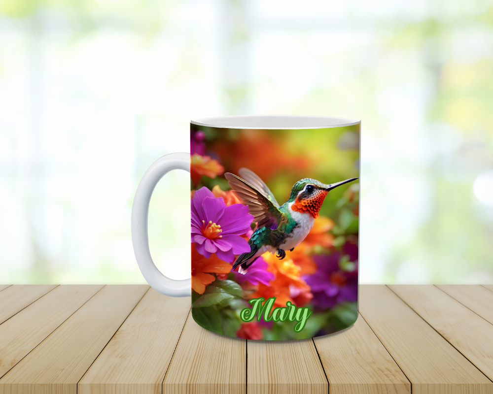 This 11-ounce ceramic mug features a stunning hummingbird in bold, vibrant colors surrounded by beautiful flowers. Add your name or gift it to someone else, and you'll have a mug that feels personal, uplifting, and truly one-of-a-kind.