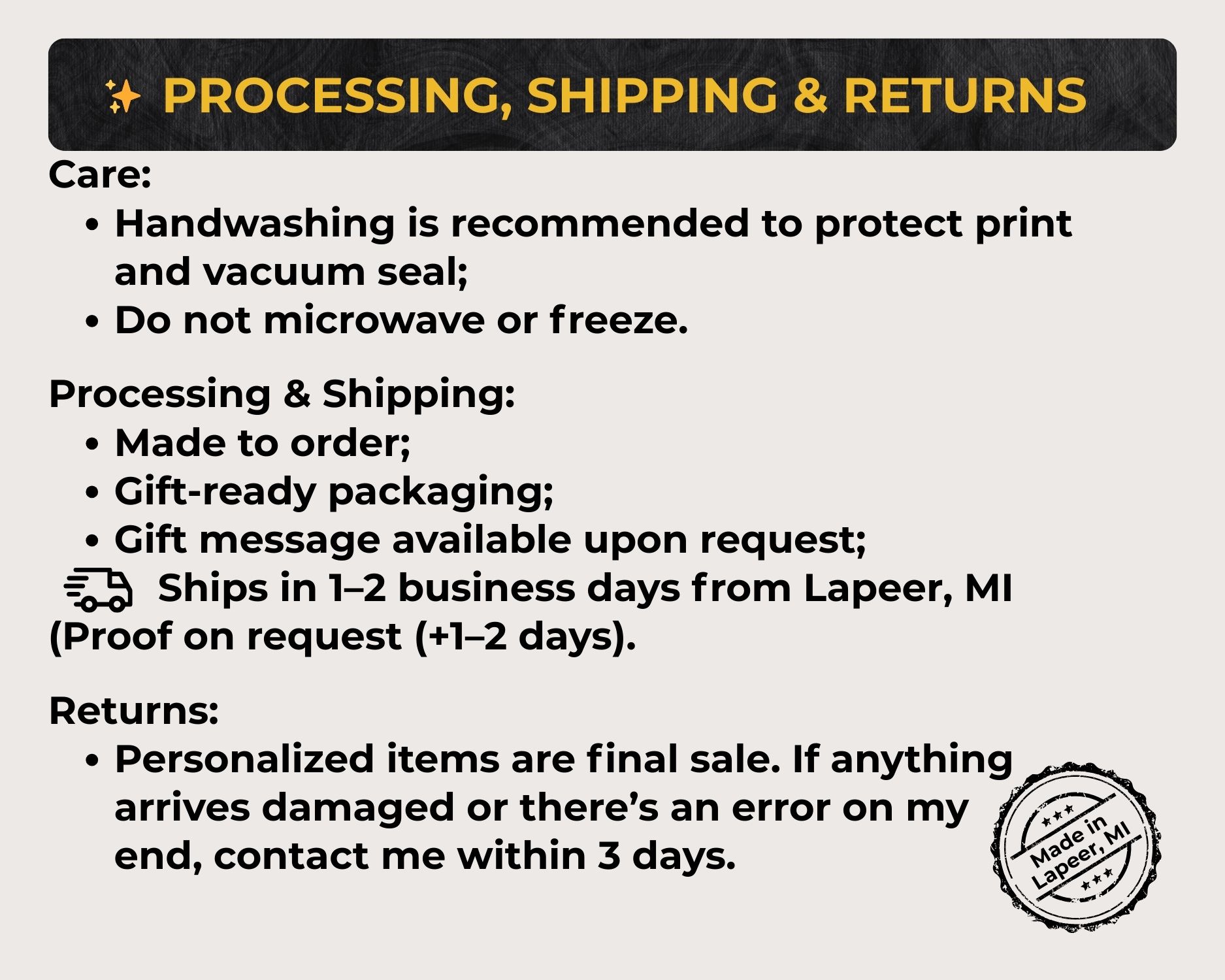 Personalized items are final sale. If anything arrives damaged or incorrect, message me within 3 days so I can fix it.