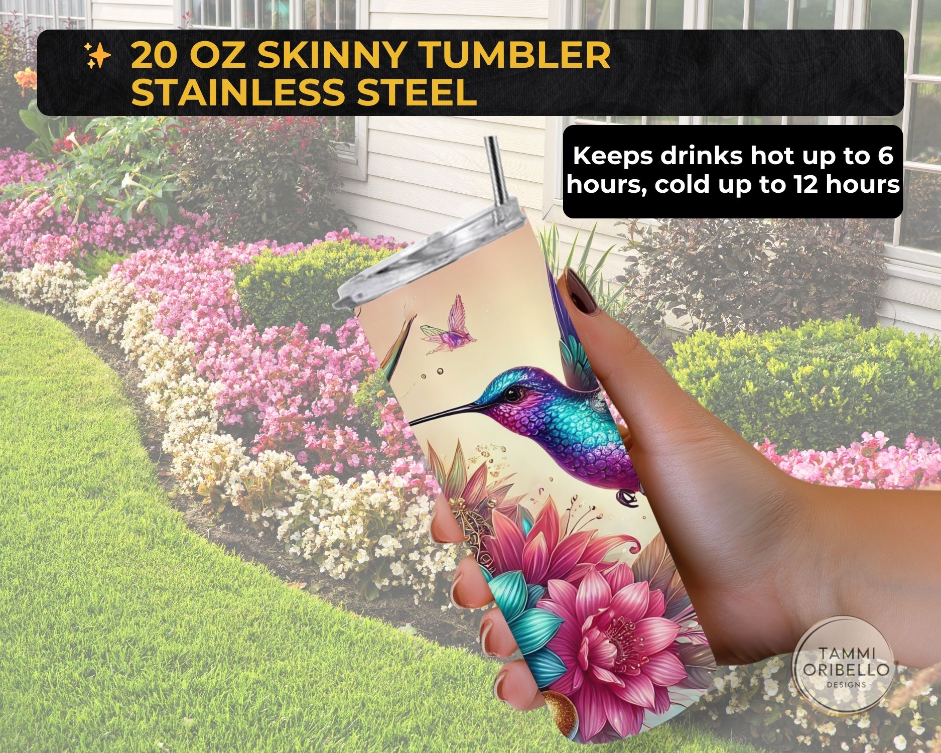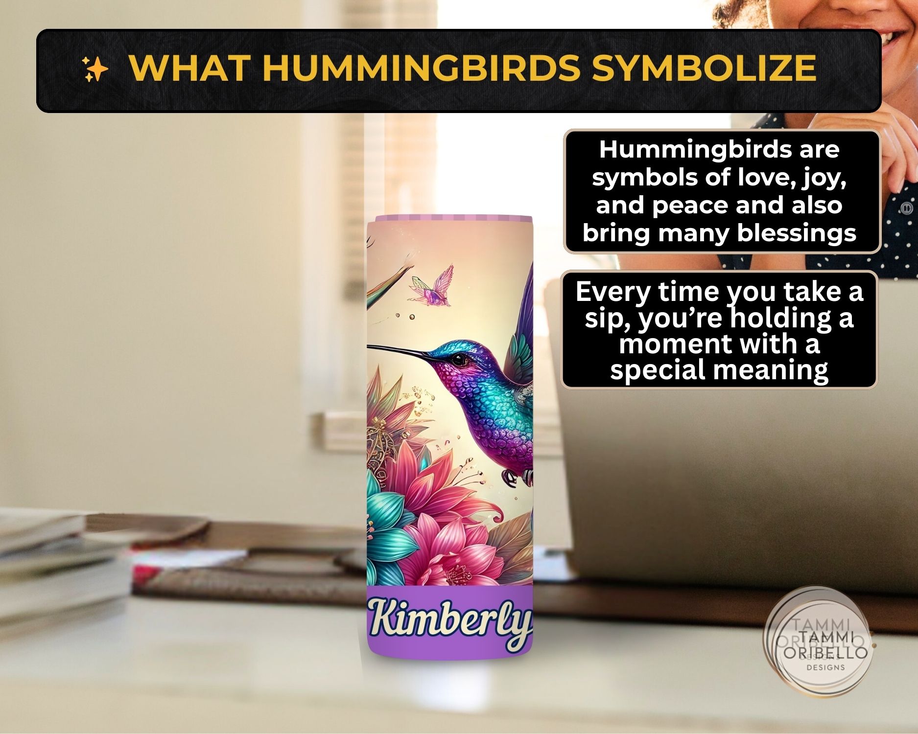 Hummingbirds symbolize love, joy, peace, and blessings. Many believe they appear when a loved one is near. Each time this tumbler is used, it carries that meaning with it.