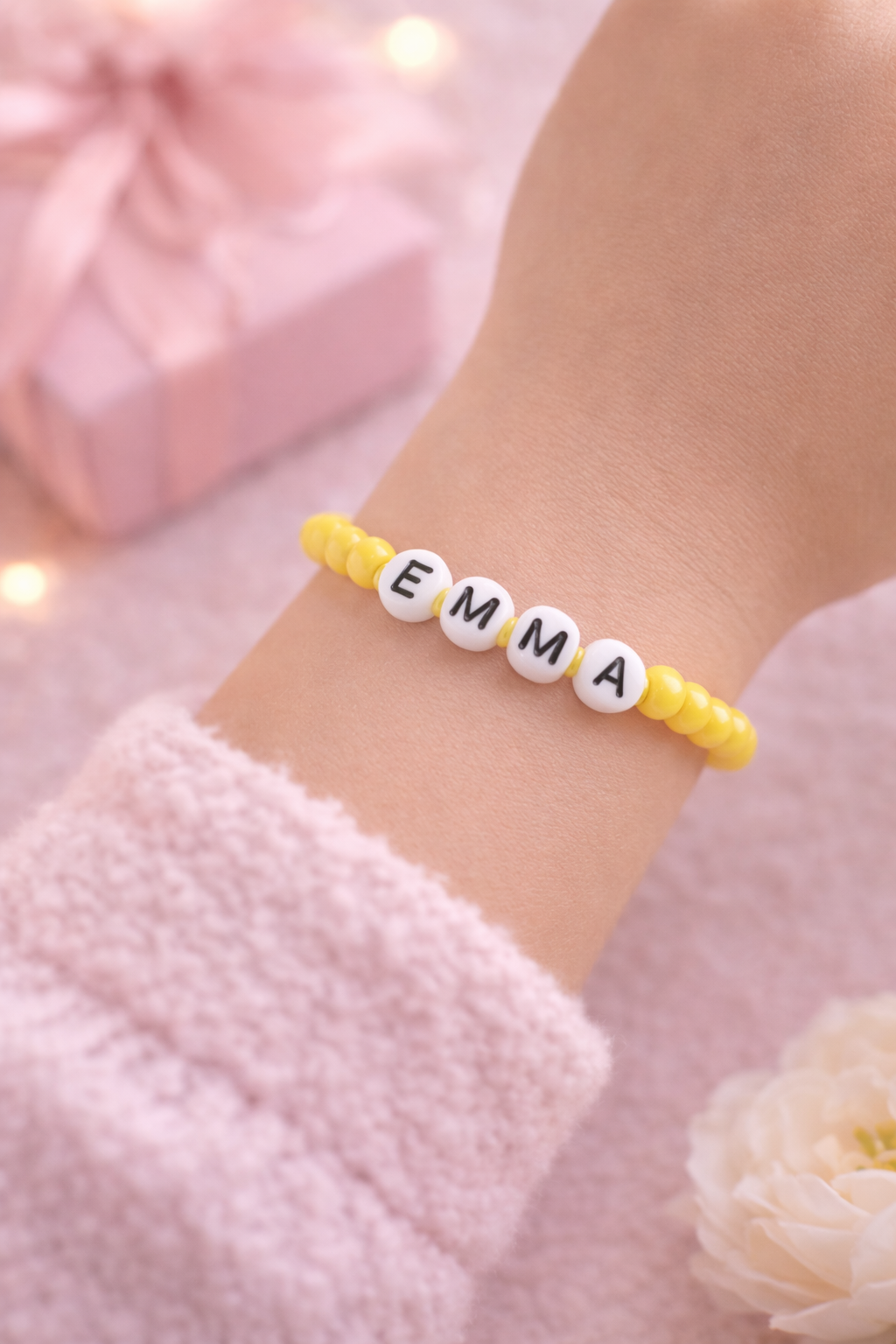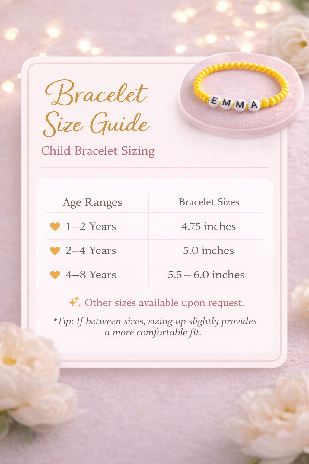 Each bracelet is carefully handmade in my home studio with attention to comfort, fit, and everyday wear. Personalized with a name or word of your choice, this bracelet is designed to be both meaningful and fun for children.