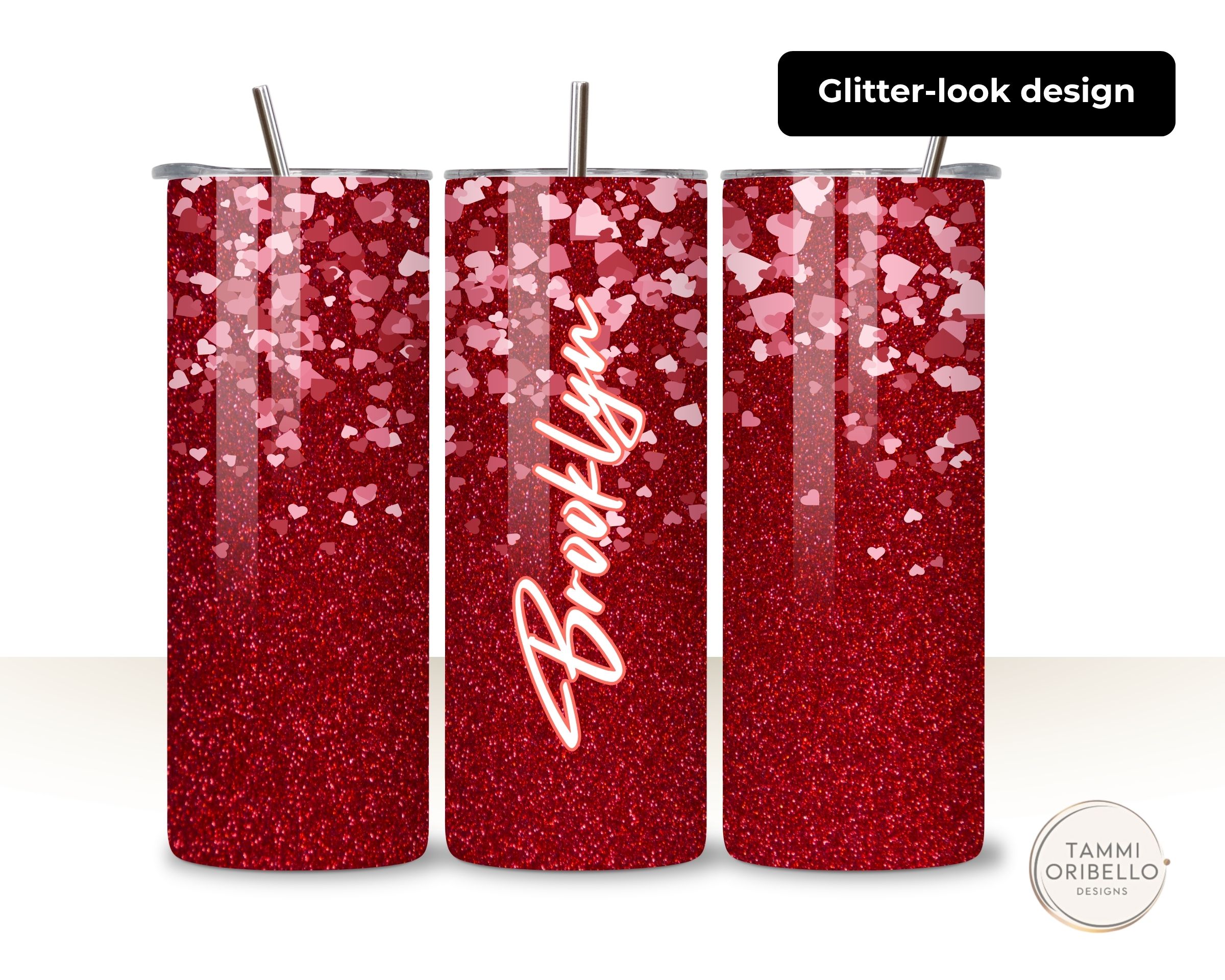 Meet your new favorite tumbler—a personalized 20 oz skinny cup with a red glitter-look hearts pattern. It’s a printed glitter effect (not real glitter) for sparkle without mess.