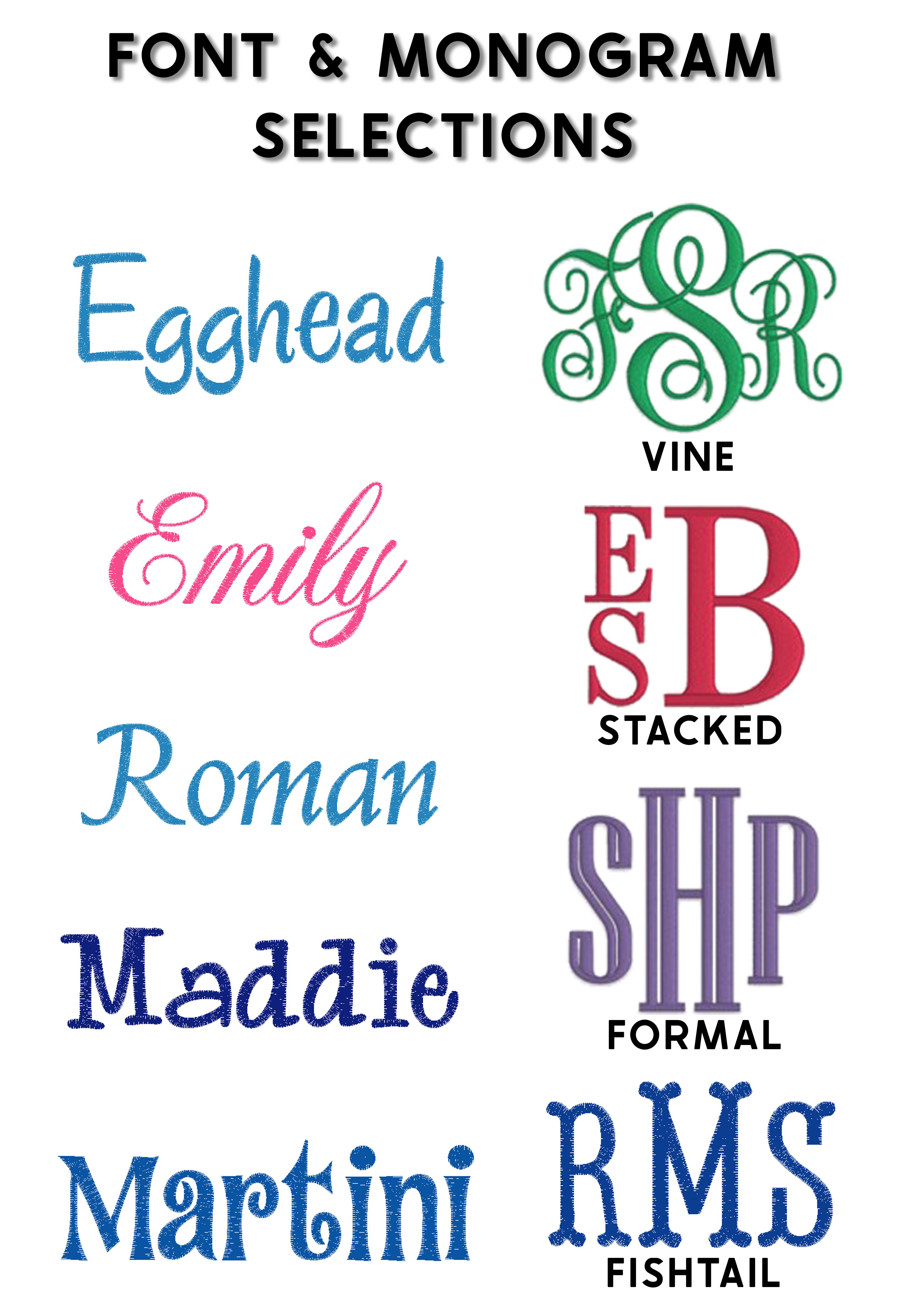 ? Thread colors are every color in the rainbow, and I have light and dark versions of almost every color. Please know that if you say you want the name to be embroidered in Chartreuse or Amaranth, I am going to Google those words and choose a thread that closely resembles them.