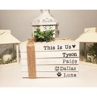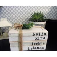 How to order:1. Choose your quantity of books2. Choose your ribbon/twine3. Choose your font and put it at the top of the personalization box.4. Add your words to the books in the personalization box. List the names/ words EXACTLY how you want them to be stacked.