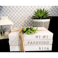 Personalized stamped stacked farmhouse books. These are unbound, hand-stamped books with the saying/names/dates of your choice. I will be using new books to create your stack so it will be beautiful, clean, and uniform in size. The spines are white and off-white. Your spines will all match. All books are stamped with black ink only, no other color ink is available. The paperback cover is removed and the binding is sanded and slightly destressed, then hand stamped with the saying/words/dates of your choice. The finished, stamped books are wrapped in jute twine with lace and burlap options, and topped with faux boxwood greenery. Stacks are shipped in protective plastic and boxed.