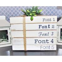 Font #1 is the default font if none is chosen. The fonts are available in typewriter, chunky, script, bold typewriter, and thin. The books are wrapped in your choice of jute twine only, lace, burlap and lace, or burlap with design. All ribbons will have a piece of twine wrapped around them to hold the stack together and will be topped with greenery.