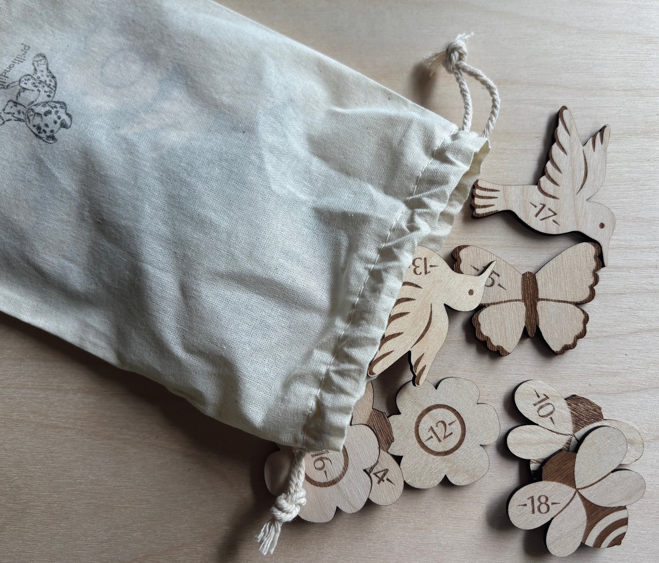 The included set of height markers includes pieces for "BIRTH", "6 MOS", and ages 1 through 18. Shapes are engraved and laser cut from 1/8" plywood and have adhesive backing for easy placement on your chart. They come in a small drawstring bag for safe keeping.