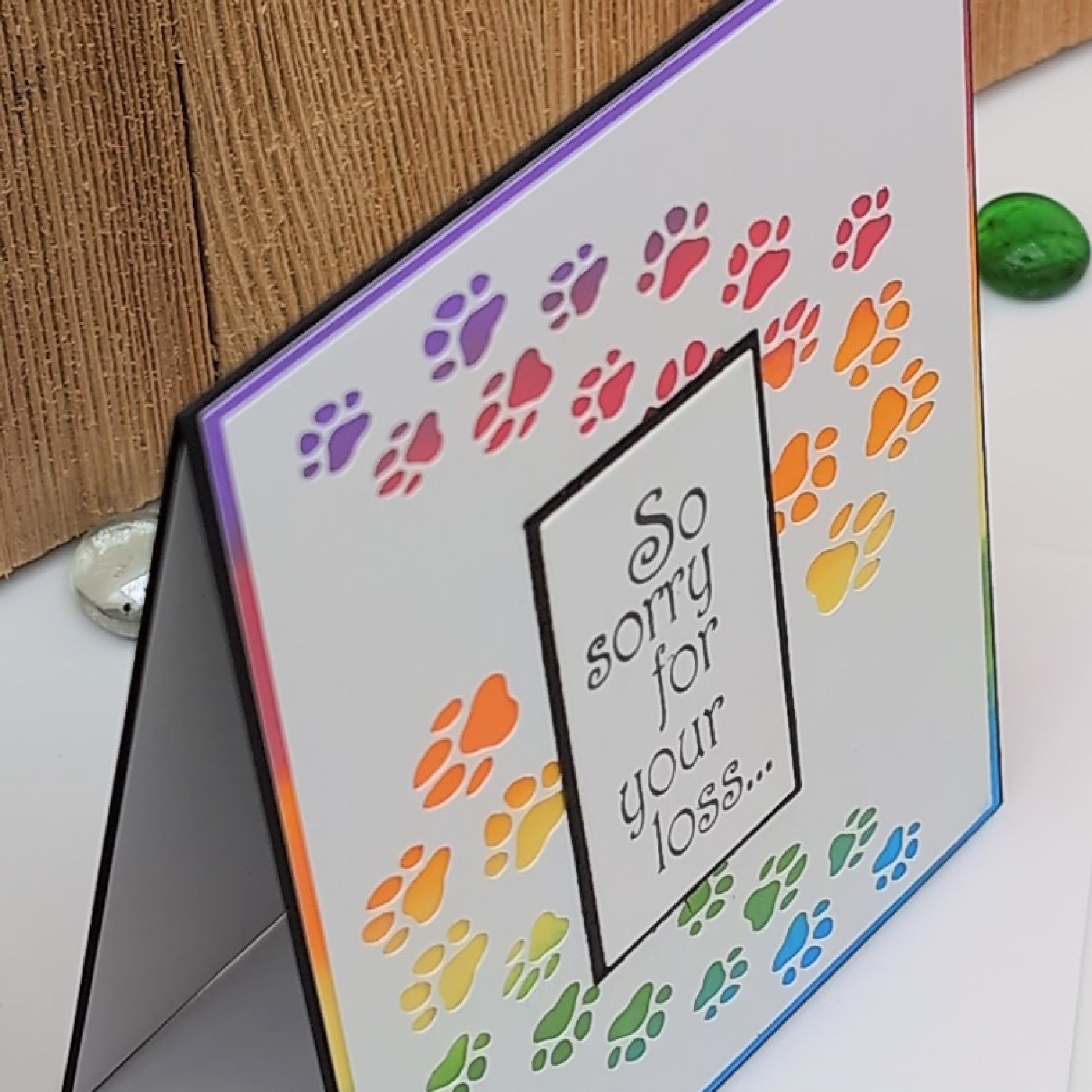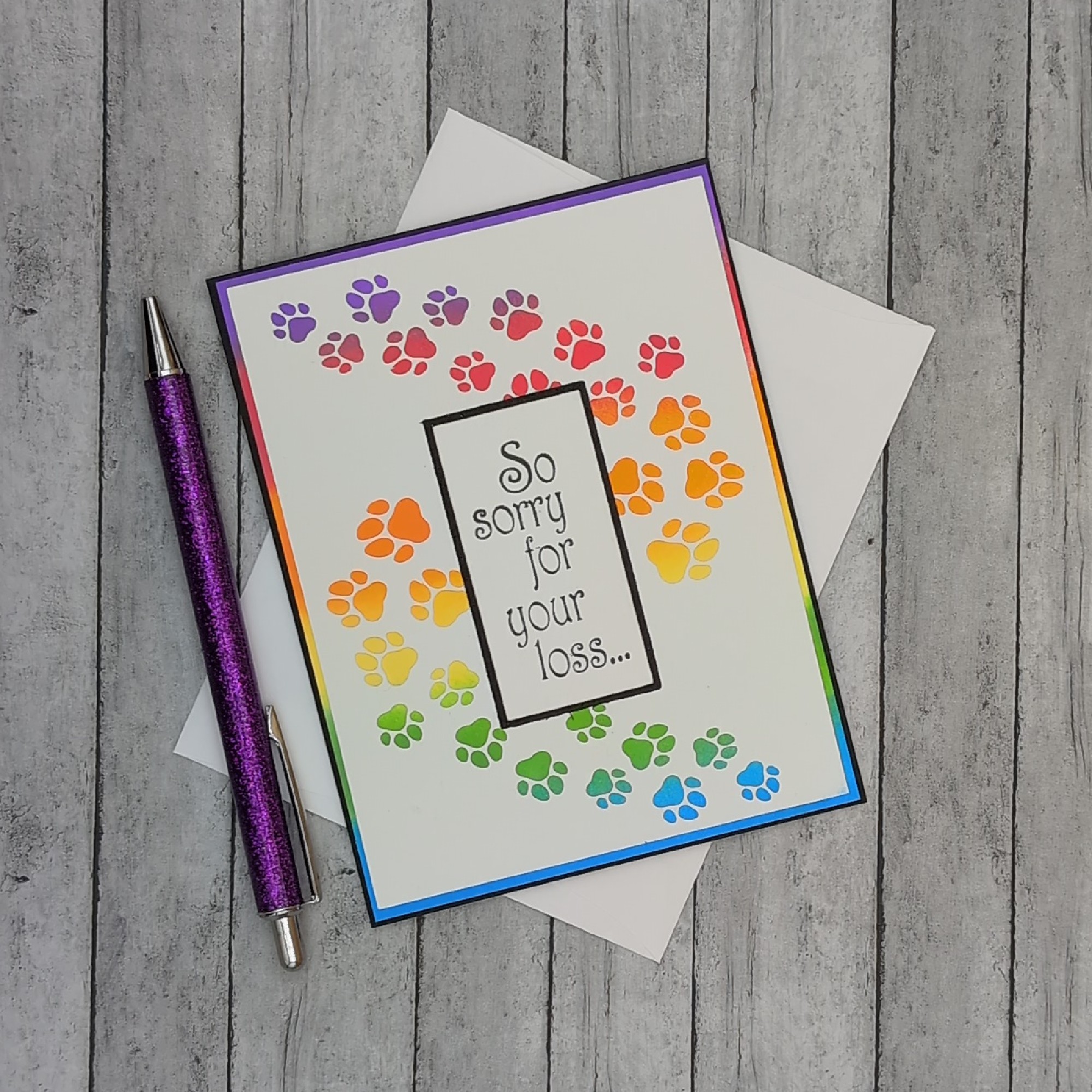 Offer comfort to someone grieving a beloved pet with this handmade sympathy card featuring rainbow paw prints and the message “So sorry for your loss…” on the front. Inside, the heartfelt sentiment “Gone from our sight but never from our hearts” provides gentle reassurance and remembrance. Thoughtfully designed to honor the bond we share with our animal companions, this card brings warmth and compassion during a challenging time. Includes blank envelope.