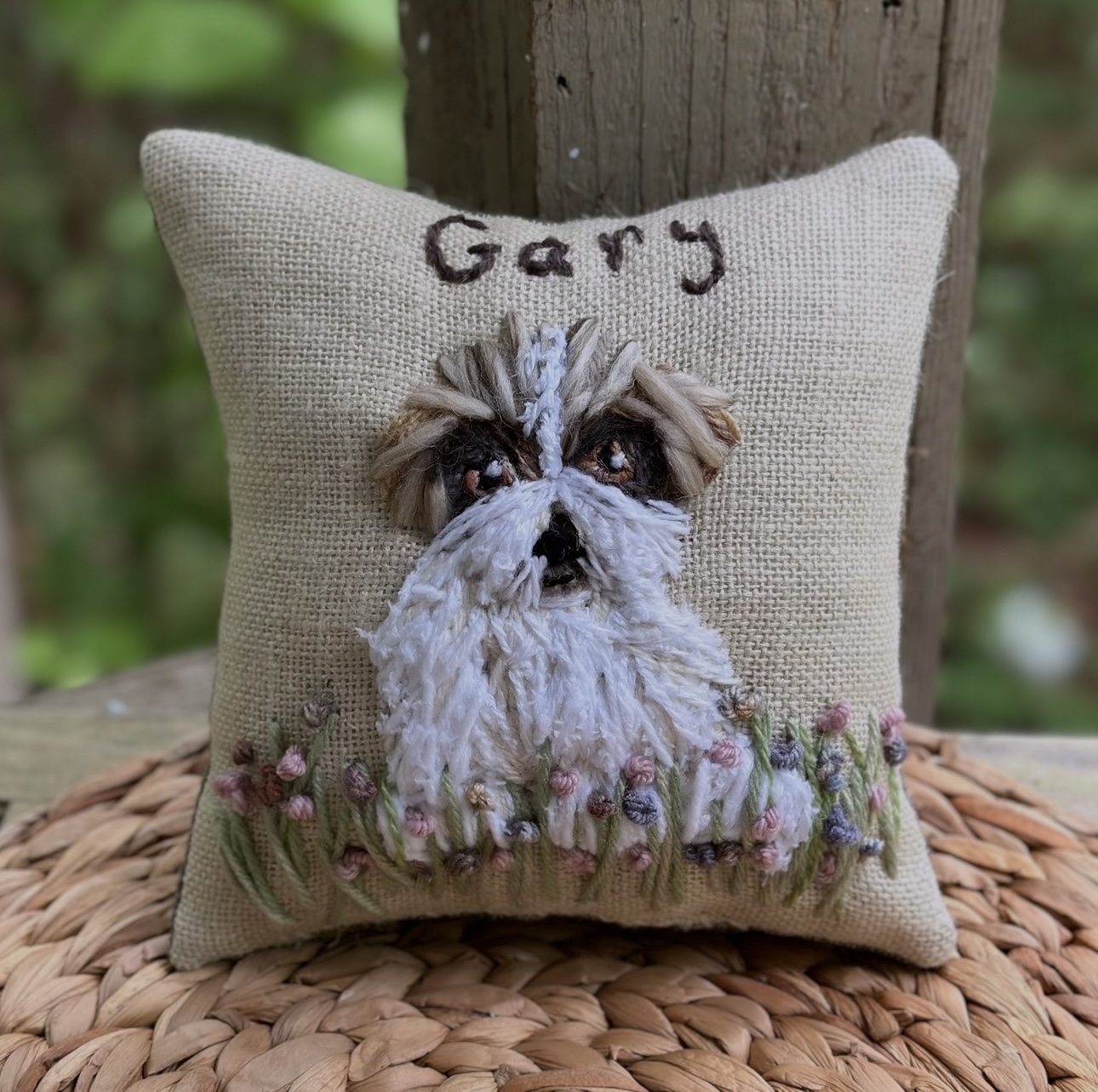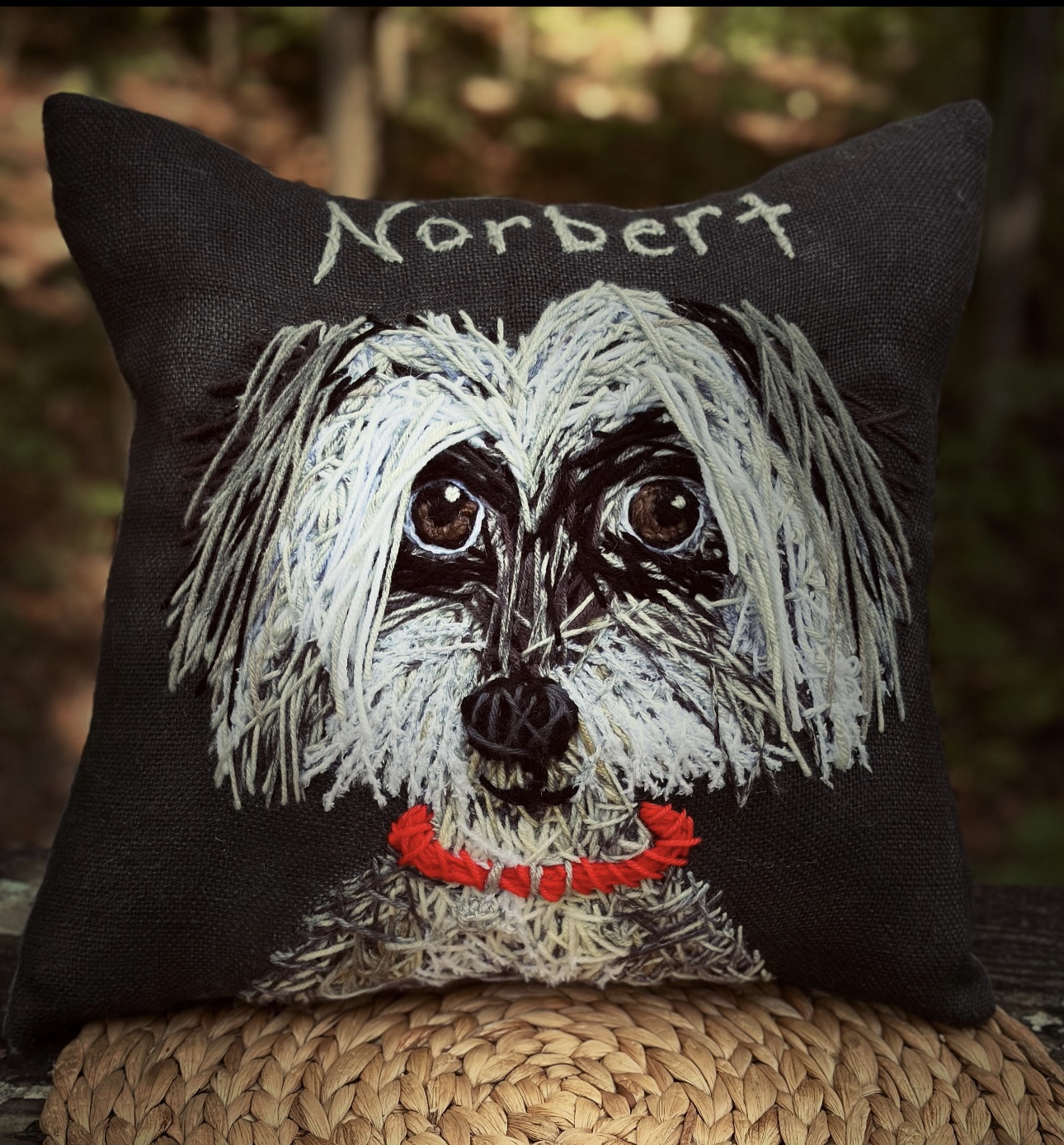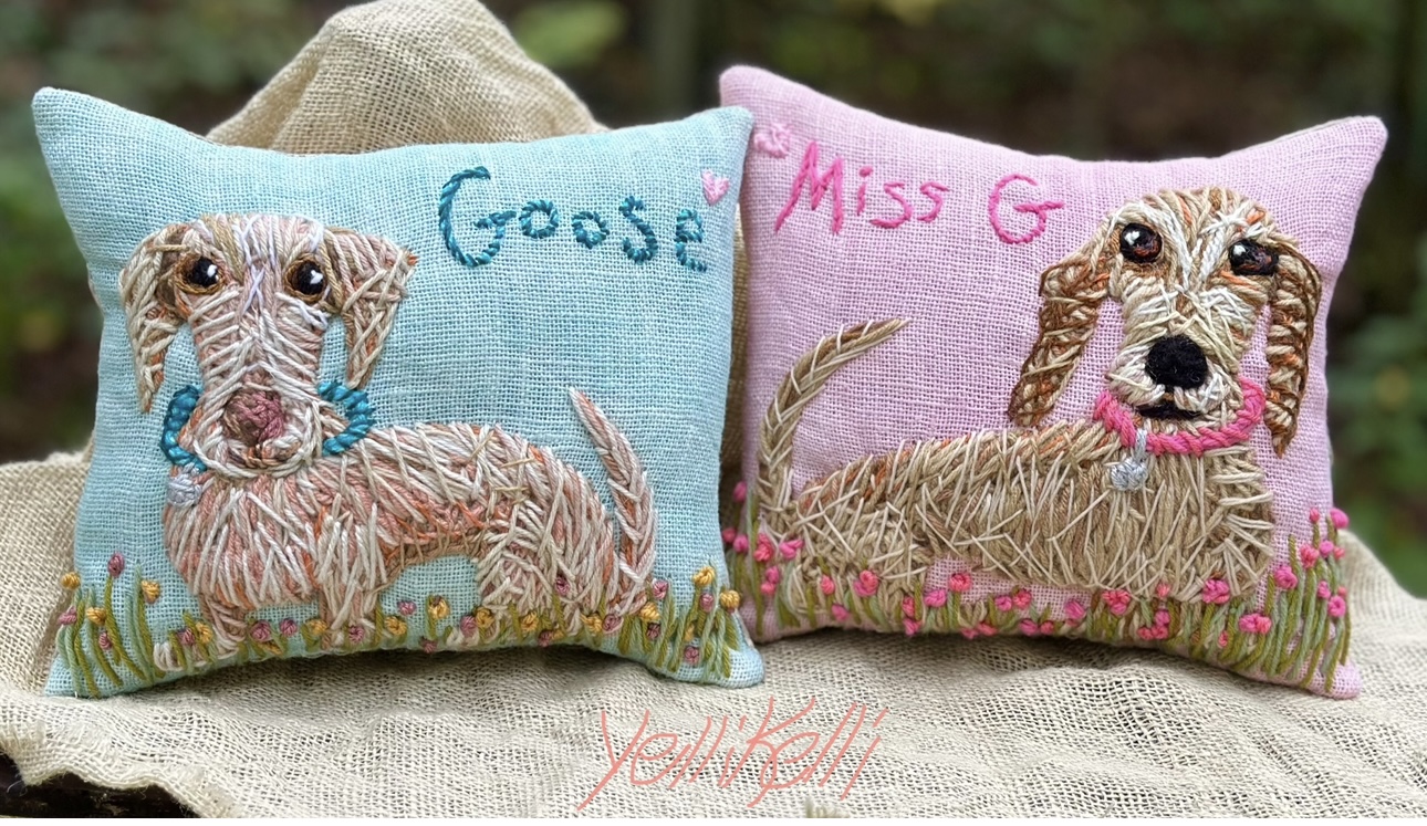 This beautiful pet portrait is freehand stitched on my large handmade pillow.