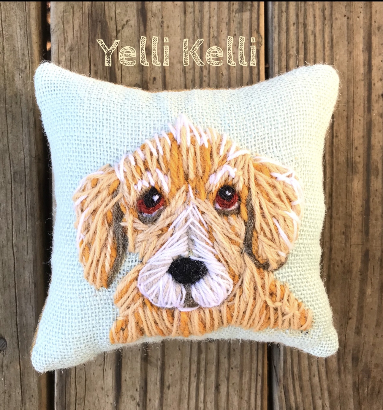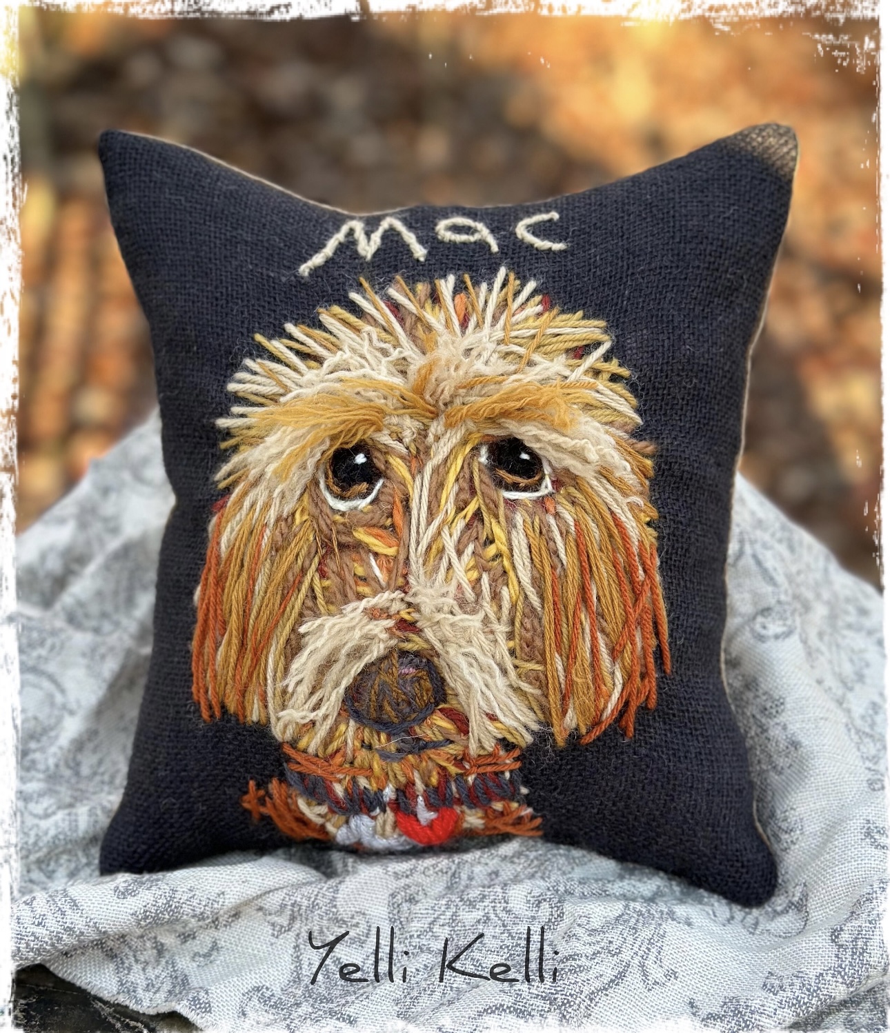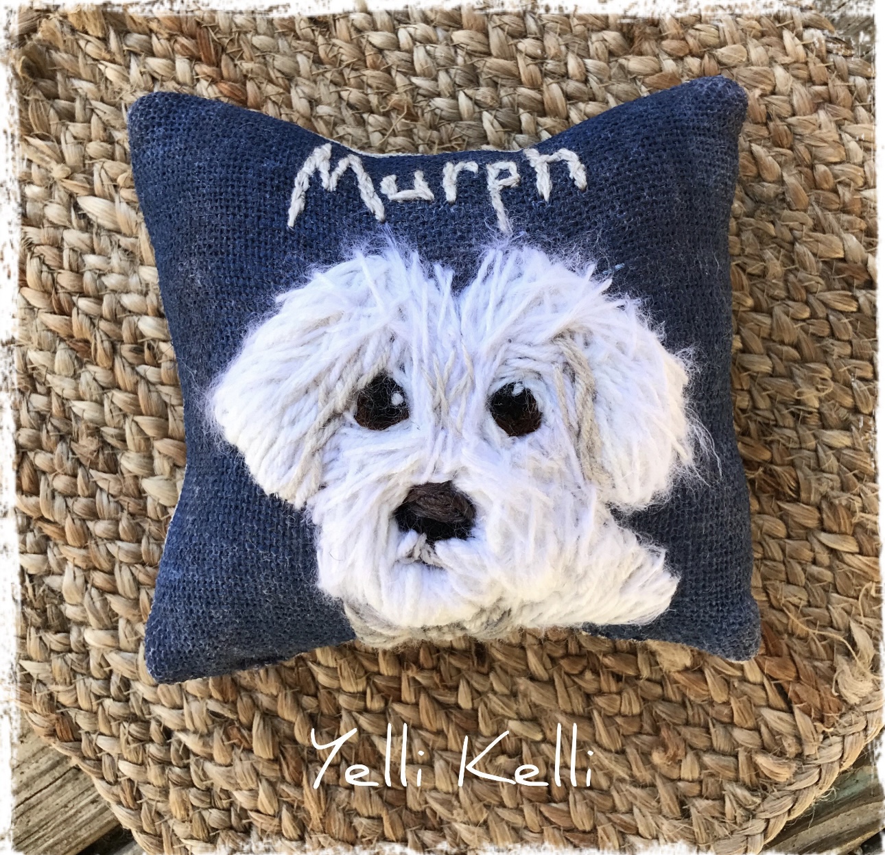 This beautiful pet portrait is freehand stitched on my large handmade pillow.