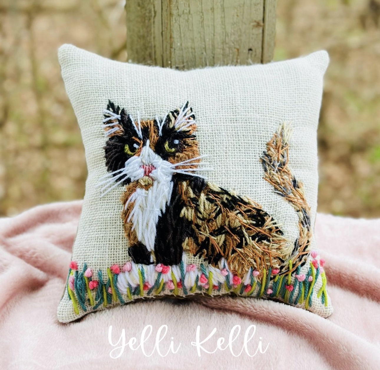 I created the Original Bohemian Name Pillow. My wonky style is rooted in crewel but with my own unique look and random stitching. I have been a working artist since I finished college. (University of Alabama, BS Fashion & Textile Design)