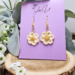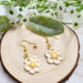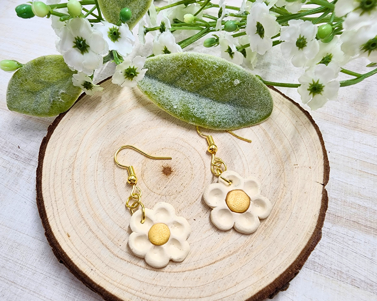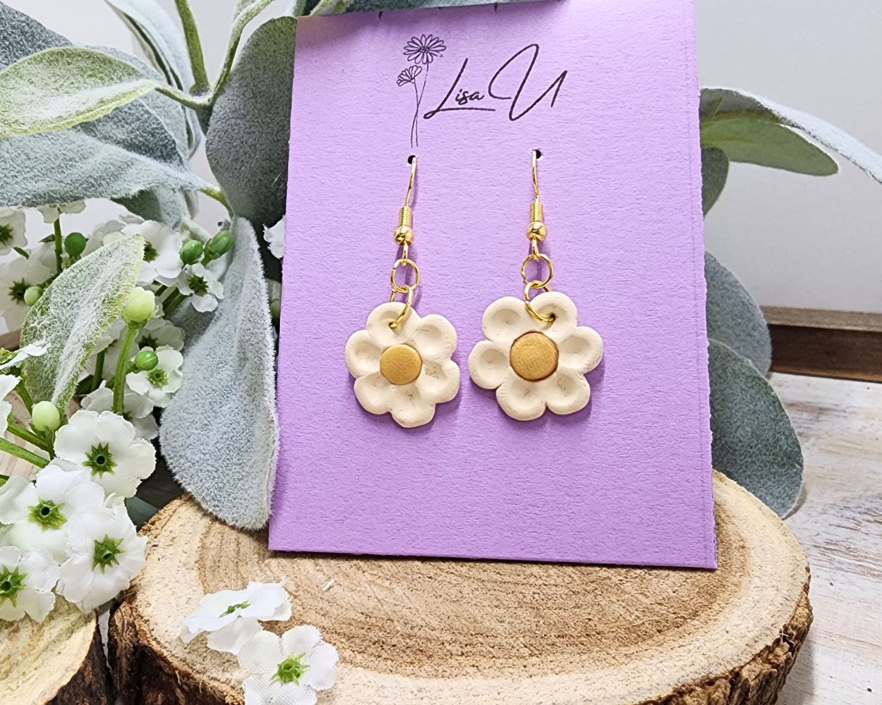 These earrings feature a lovely off-white/cream daisy shape with gently rounded petals and a charming gold center. They hang from gold-tone ear wires, creating an elegant drop that is perfect for any occasion—from a casual coffee date to a garden party.