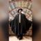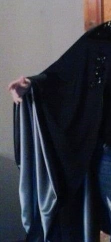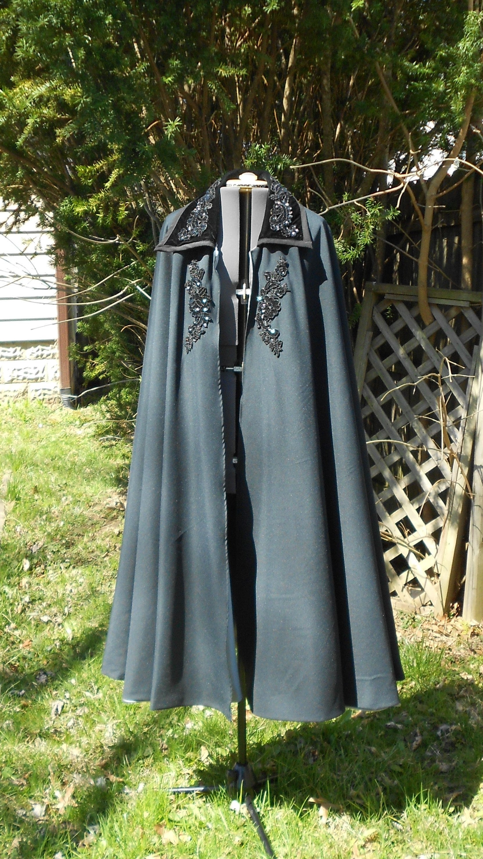 Made from a high quality black suiting fabric and lined with heavy gray satin, the weight of this cloak is amazing! Weighing in at nearly 4lbs. It has hand sewn beaded appliques on a velvet collar. The one shown has hand sewn black beaded sequin applique clusters on the front, on the velvet collar and on the back. Made to resemble the cloaks worn in the anniversary performance and US tour. **ALSO available WITHOUT the beaded appliques for Renaissance or Masquerade. Approximate length of the one pictured is 54". This can be custom length up to 58".