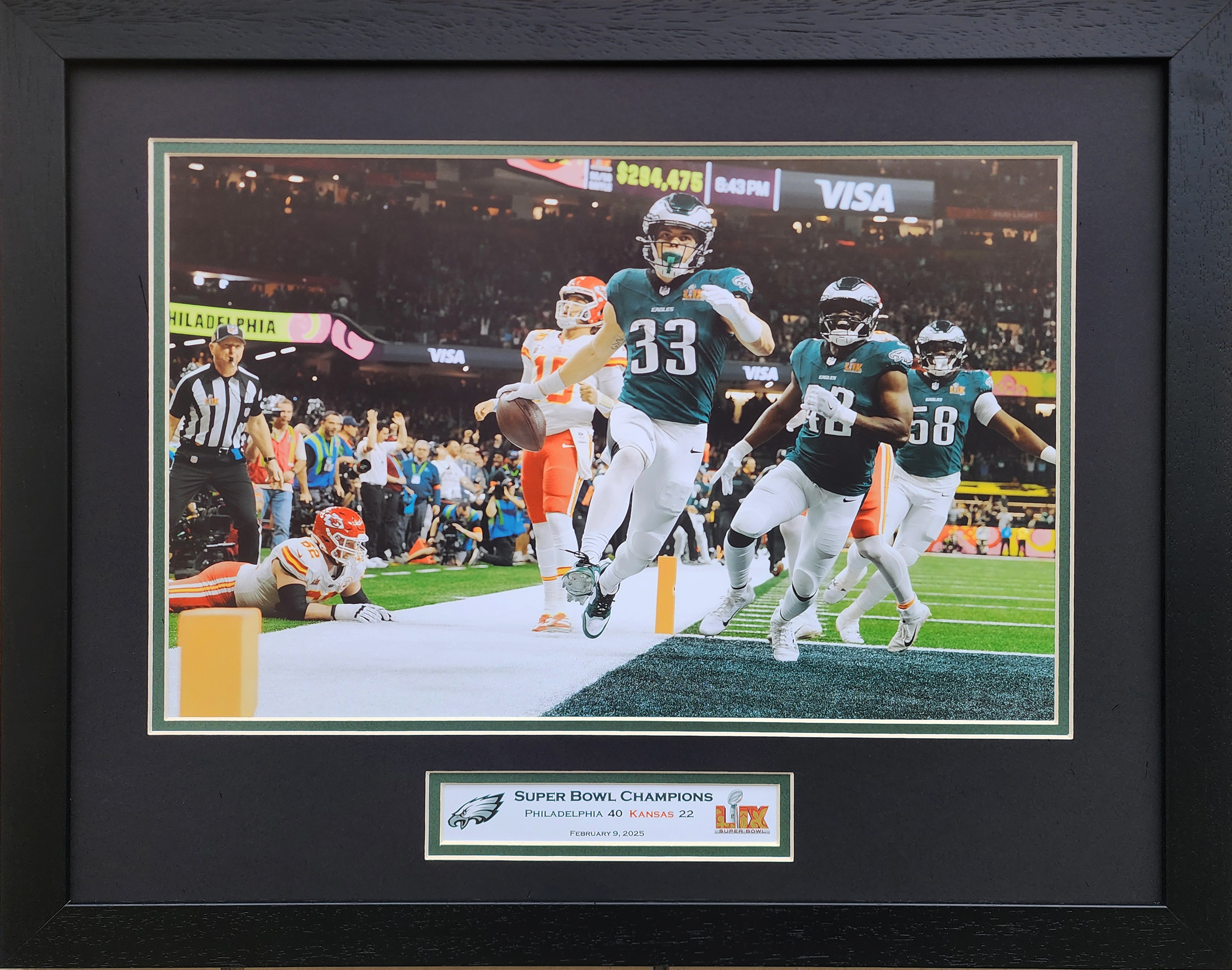Celebrate the Philadelphia Eagles 2025 Super Bowl Championship victory over the Kansas City Chiefs with this one of a kind custom framed picture. Undoubtedly the centerpiece of any fans collection.Measuring 20 x 16 inches and framed in durable hand crafted moulding from the species white Oak. Double matted in Cresent Select matting with nameplate depicting the event. Permanently dry mounted to Bainbridge foam core to ensure the print never wrinkles or bubbles even in the most severe environments. Encased in Tru Vue UV protected acrylic glass to ensure superb clarity and intact shipping. Heavy duty black craft paper dust cover or backing. Heavy duty AMS hangers with 150 pound rated braided steel wire hanger. Complimentary artwork hanger with every order for effortless installation.Materials Used:-Handmade wooden moulding from the species oak-AMS heavy duty wire hangers-Tru Vue UV protected acrylic glass-150 pound braided steel wire hanger-Bainbridge foamcore-Cresent Select matboard-Complimentary artwork hanger-Heavy Duty black craft paper backing-Premium drymount tissue-Fletcher Terry framers points-Scappa double sided professional grade tape-Epson premium luster photo paper 100 pound