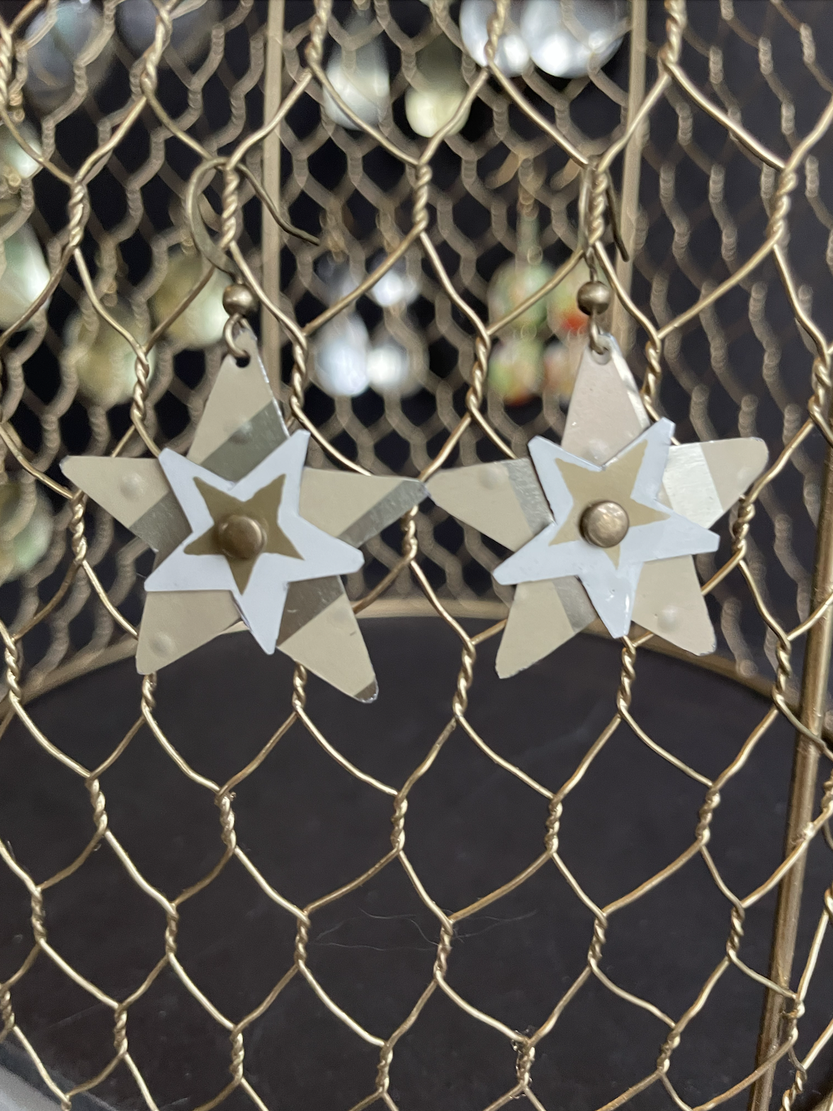 My niece made some earrings for herself out of one of these tins and inspired this collection. I've embossed some of the stars, and all are riveted to stack 2 different stars on each earring. The earrings are antiqued brass with no nickel, and have rubber stoppers on the back so they won't fall out of your ears.