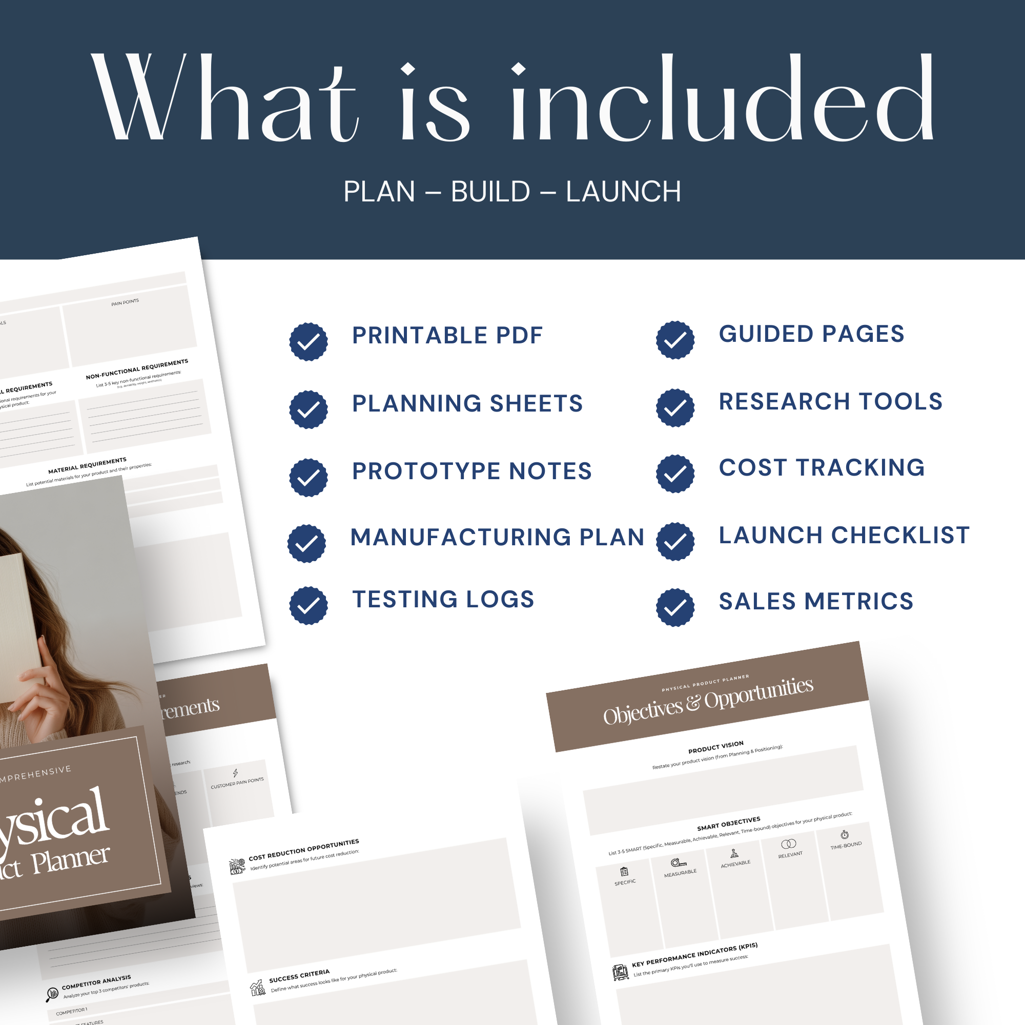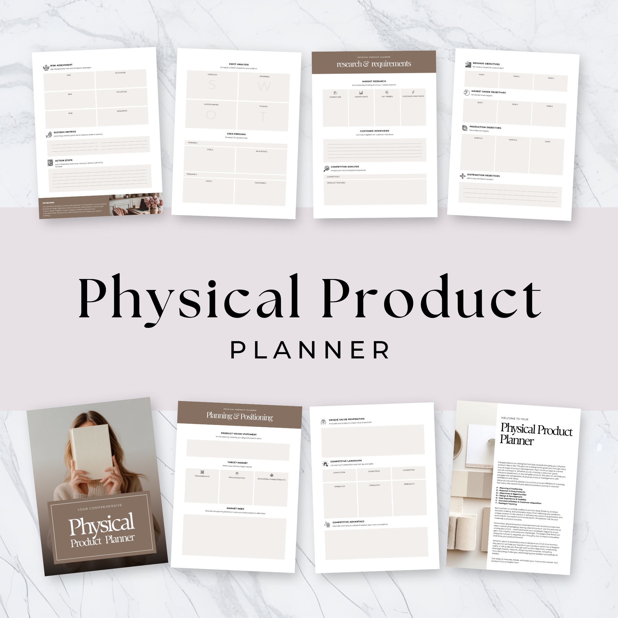 This Physical Product Planner (Printable PDF) gives makers, inventors, and small business owners a structured place to plan every stage of developing a physical item — from first concept through manufacturing, testing, and launch.