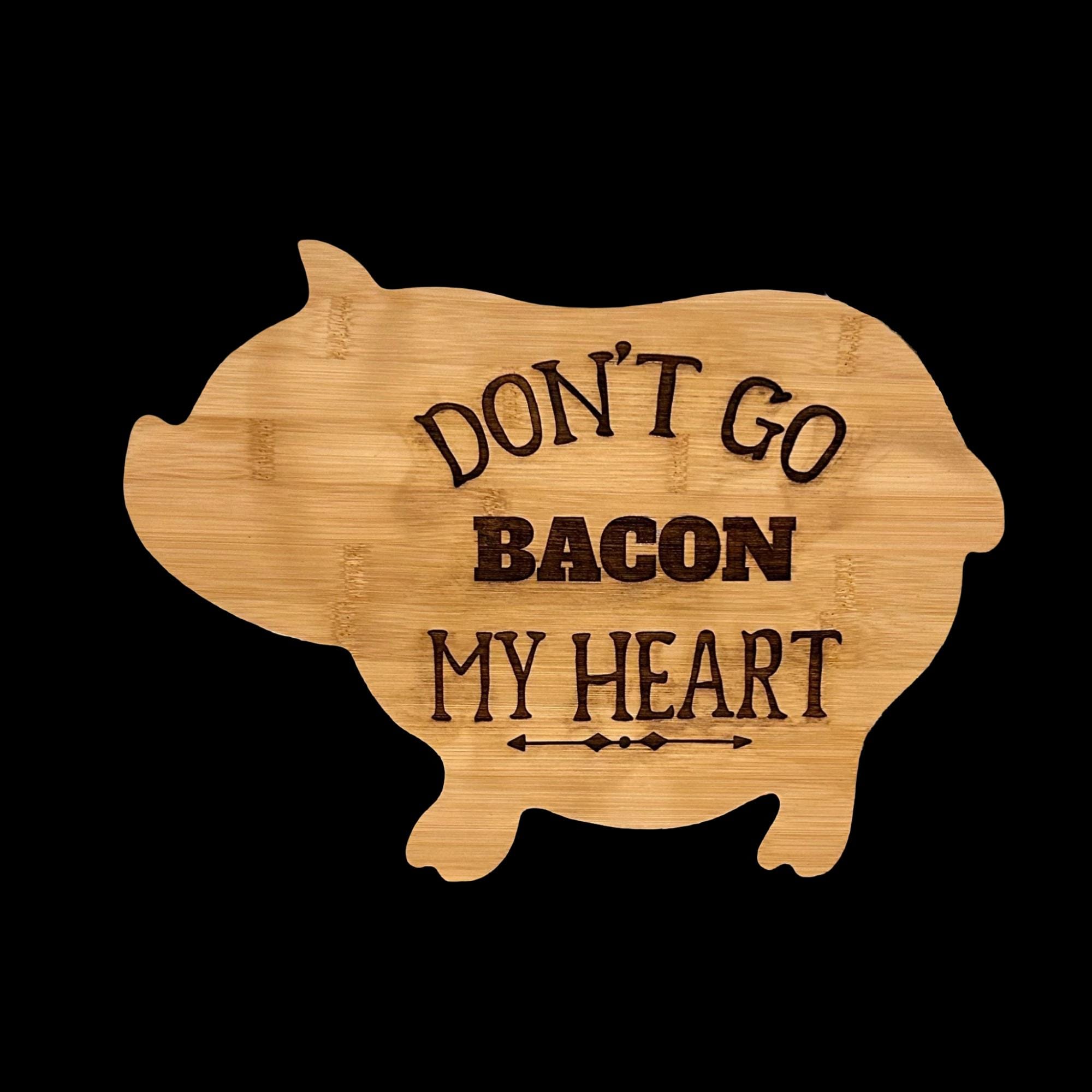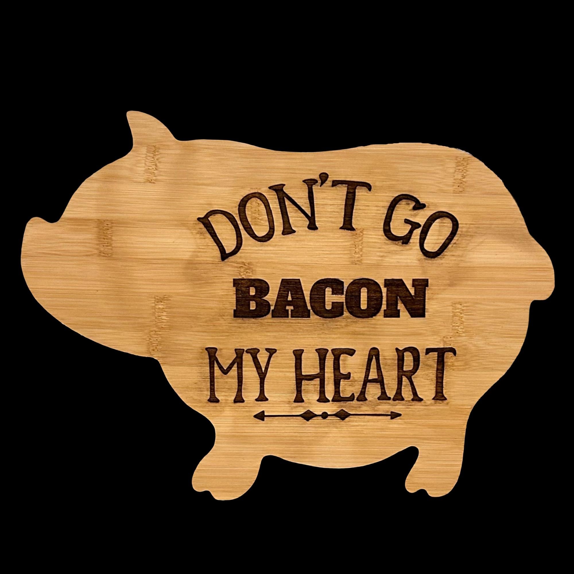 This is a bamboo pig shaped cutting board. It is approx. 13 3/4" x 8 3/4" in size. It is engraved with the saying "Don't Go Bacon My Heart". It has a saw-tooth hook on the back for hanging. It is NOT recommended for use on the engraved side. If you want to use, do so on the unengraved side. Hand wash ONLY, Not dishwasher safe.