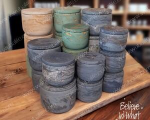 I absolutely love custom orders!! Depending on your order will depend on how long it will take to make. If you request a soap loaf or soap loaf cut into bars or even half a soap loaf, with a certain color, design and scent it will take 4 weeks. That includes, making, curing time and packaging. The same with candles. All custom made vessels/candles take about three weeks. Once I make the concrete vessels it takes 2-3 days to cure, then another day to seal. On top of that, it takes another 2 weeks for the wax to cure in the vessels. So plan ahead!! I will inform you step-by-step of the goings on in making your order by sending you pictures of the making and the waiting process via email or text. It's so much fun seeing your order come to life! If you have any questions or want to place a custom order please contact Melissa.