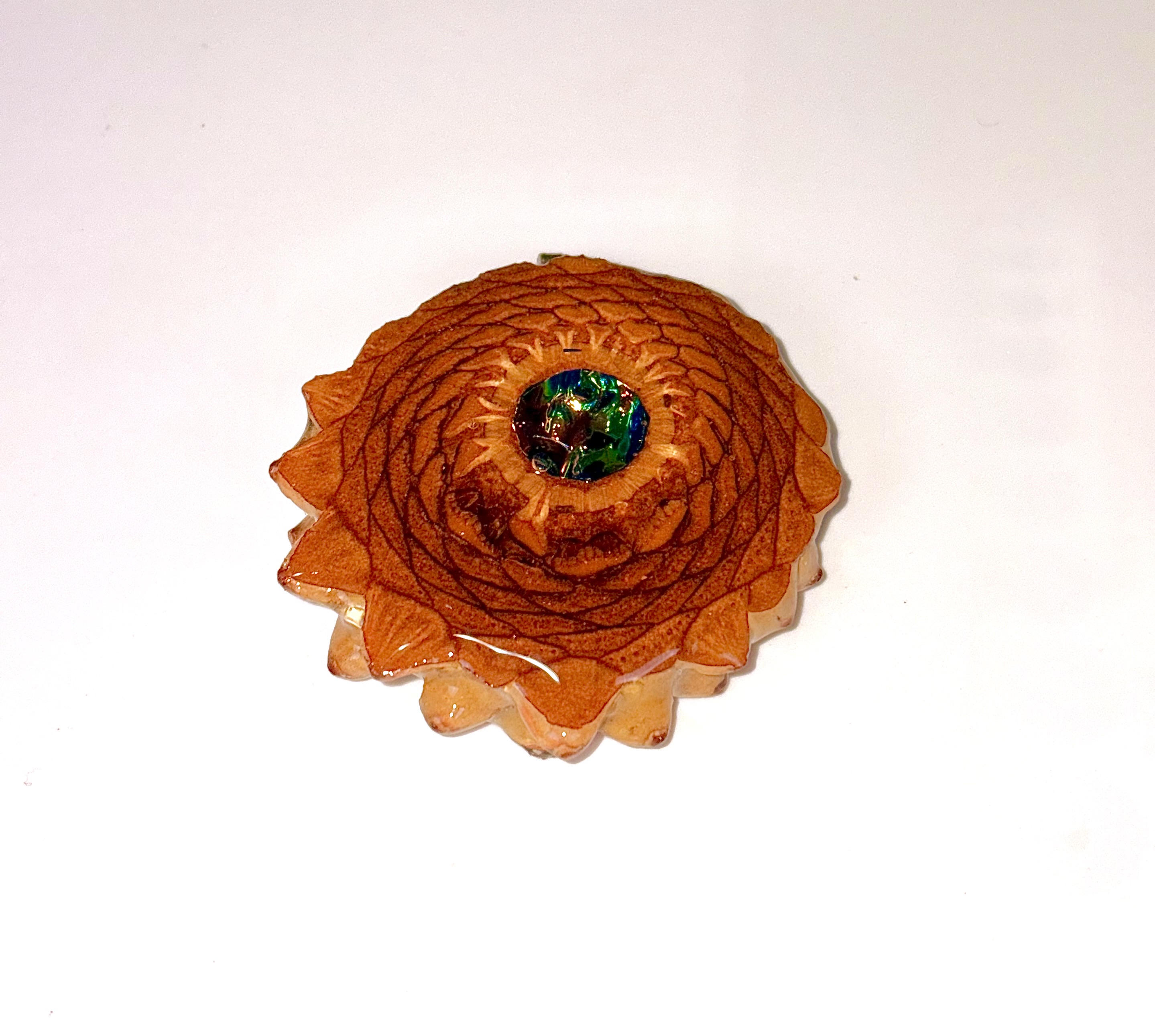 Discover a truly unique piece that captures the symmetry and beauty of the natural world. This stunning pendant features a spliced cut of a real pine cone, covered in glossy resin providing a glistening shine.