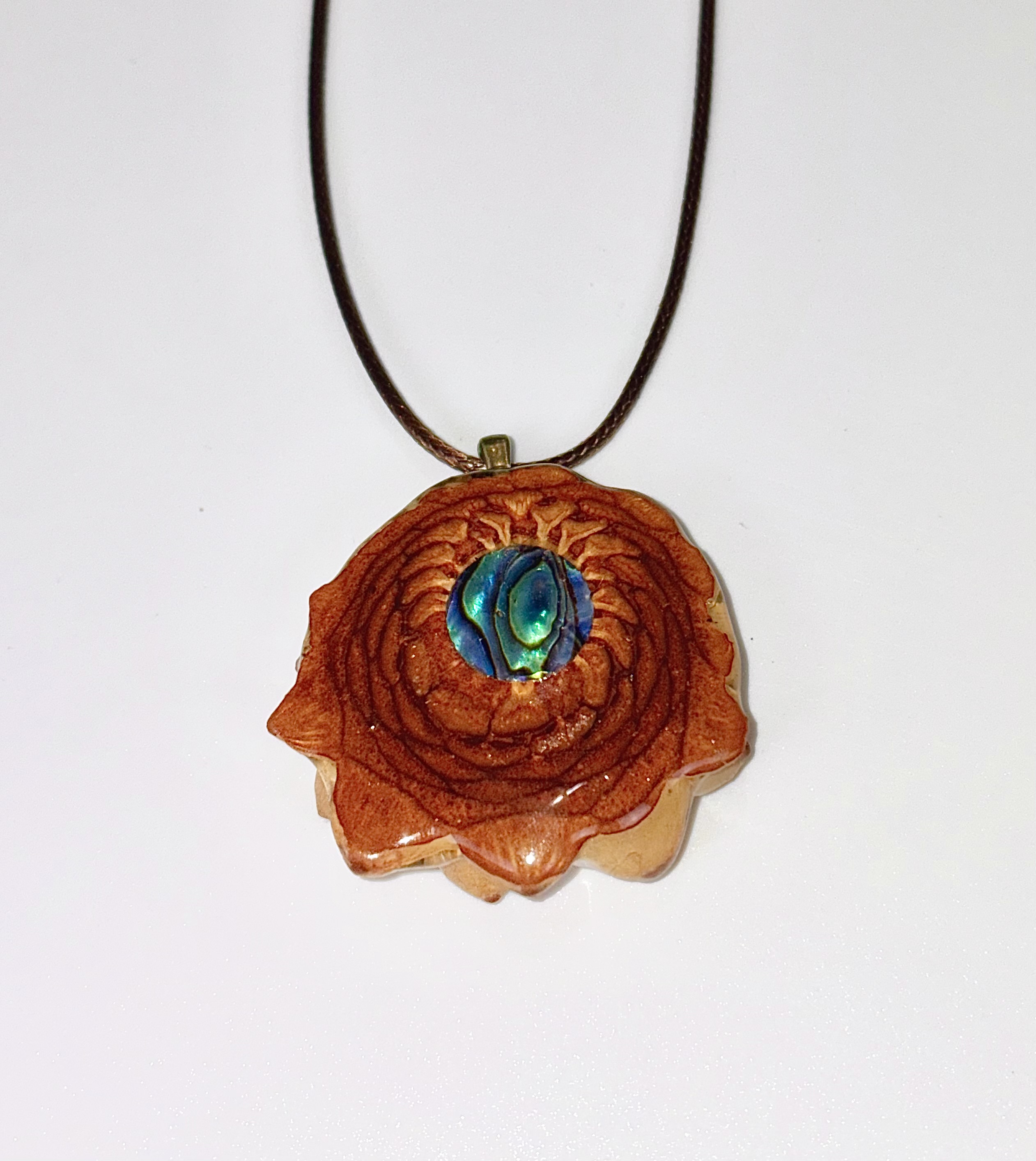 At the heart of the pendant is a round glossy piece of abalone shell, eye-catching and iridescent, that displays brilliant flashes of green, blue, and black. This striking contrast between the earthy wood and the vibrant shell center makes it a true statement piece.
