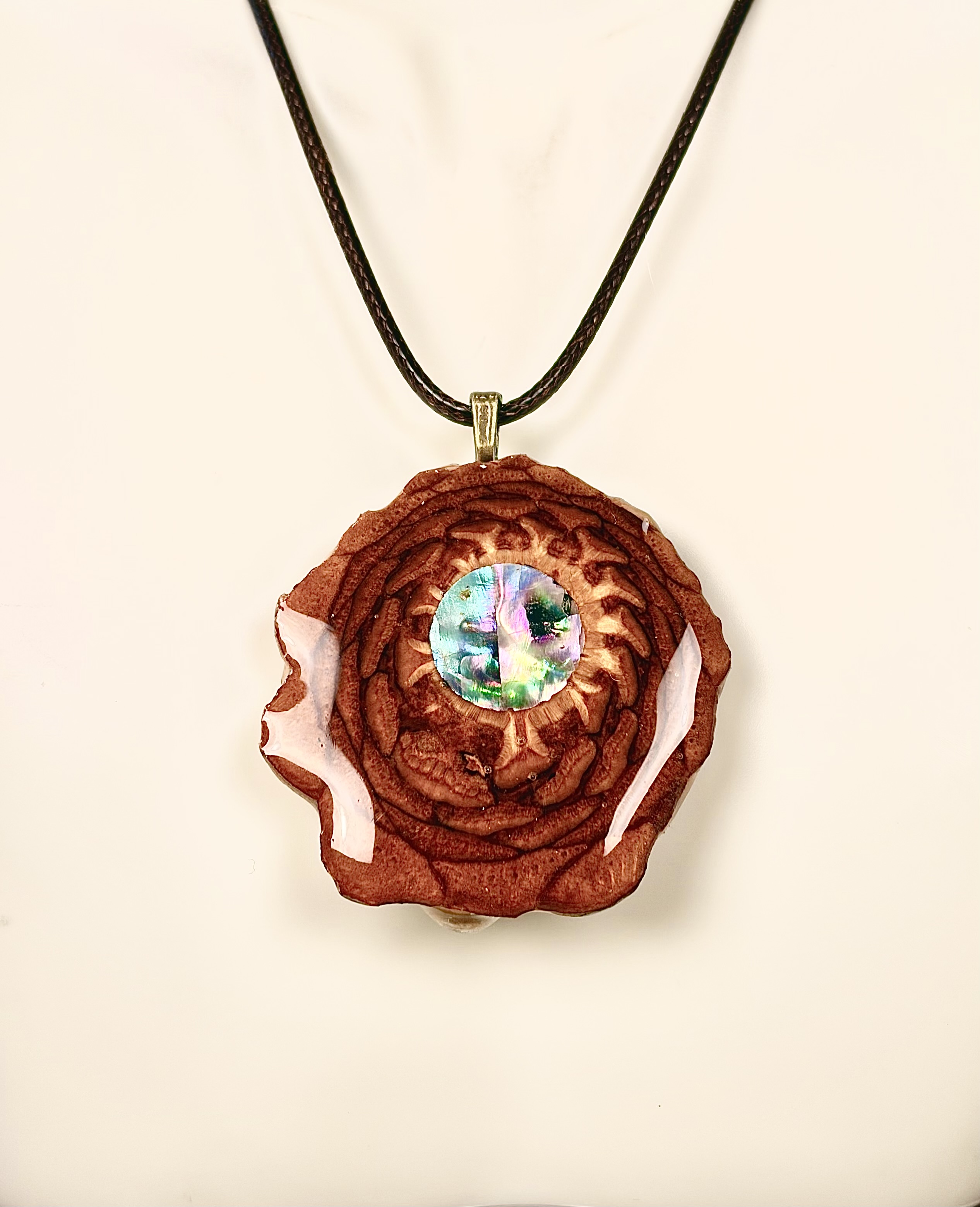 At the heart of the pendant is a round glossy piece of Mother of Pearl shell, eye-catching and iridescent, that displays brilliant flashes of peacock blues, greens, golds, and magentas. This striking contrast between the earthy wood and the vibrant shell center makes it a true statement piece.