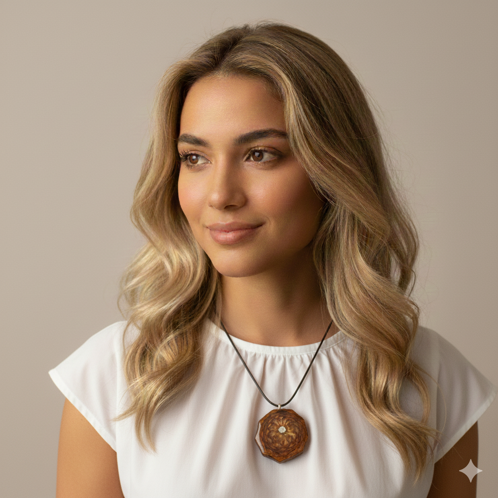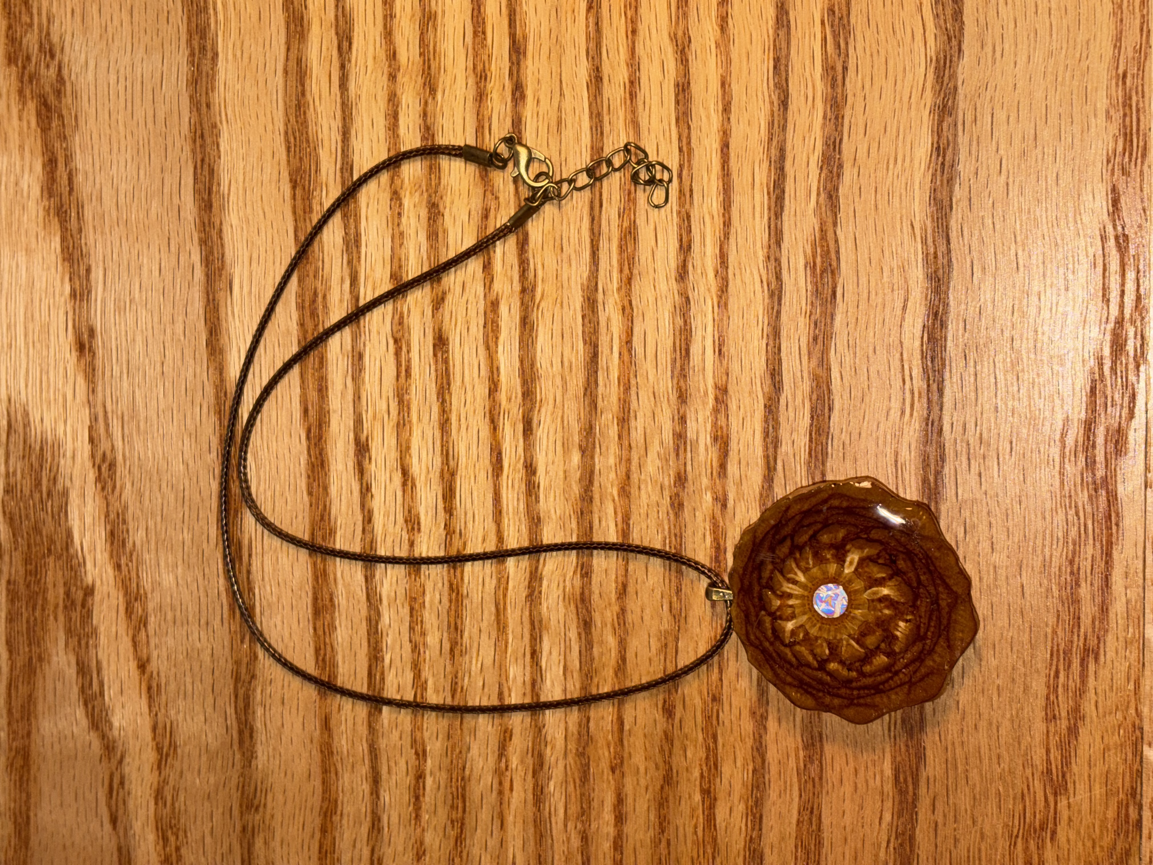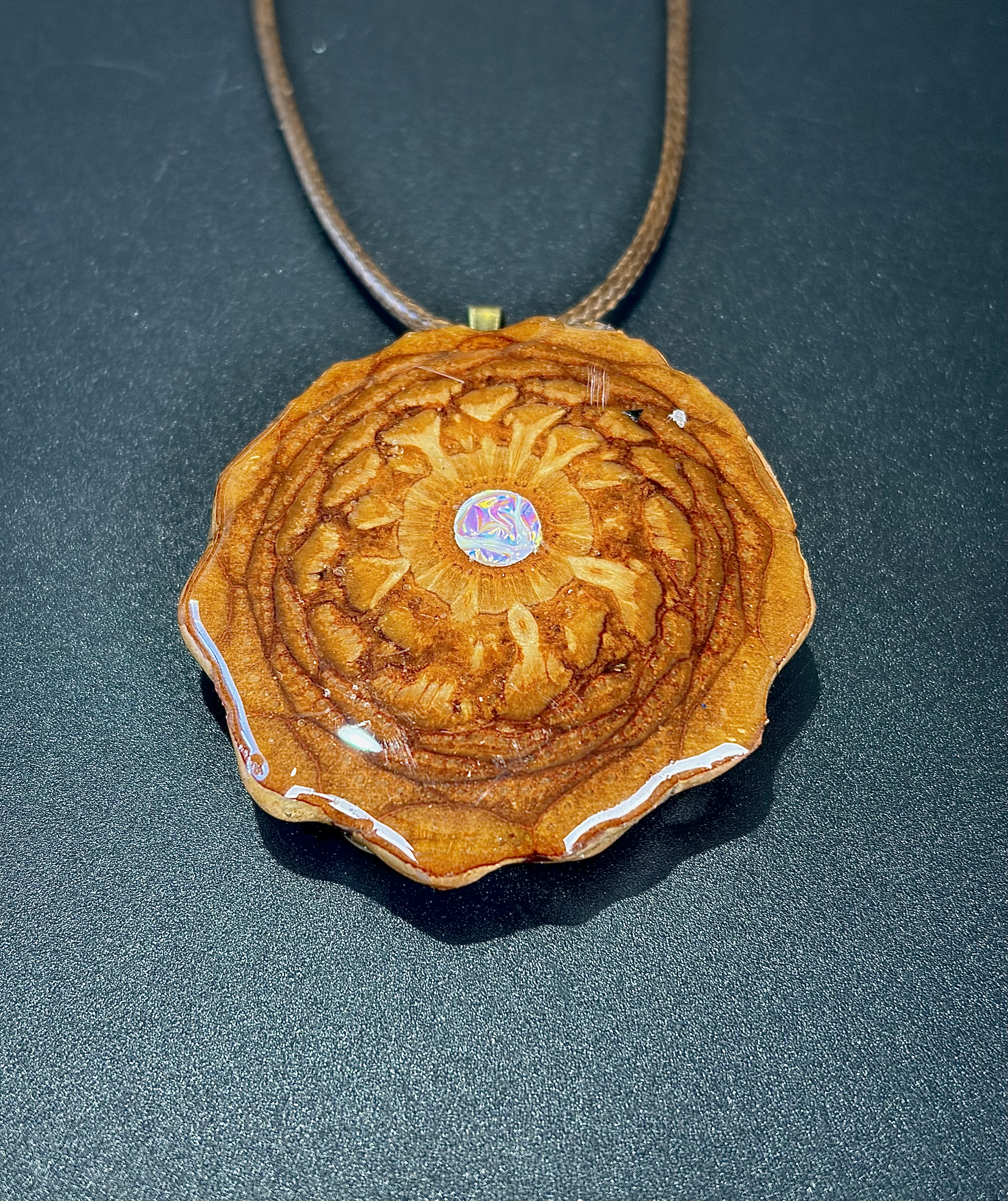 Unveil the hidden beauty of nature with this exquisite, handmade pendant necklace. Crafted from a genuine cross-section of a pine cone base, the pendant reveals a mesmerizing, natural rosette pattern often called a "Pine Cone Flower."