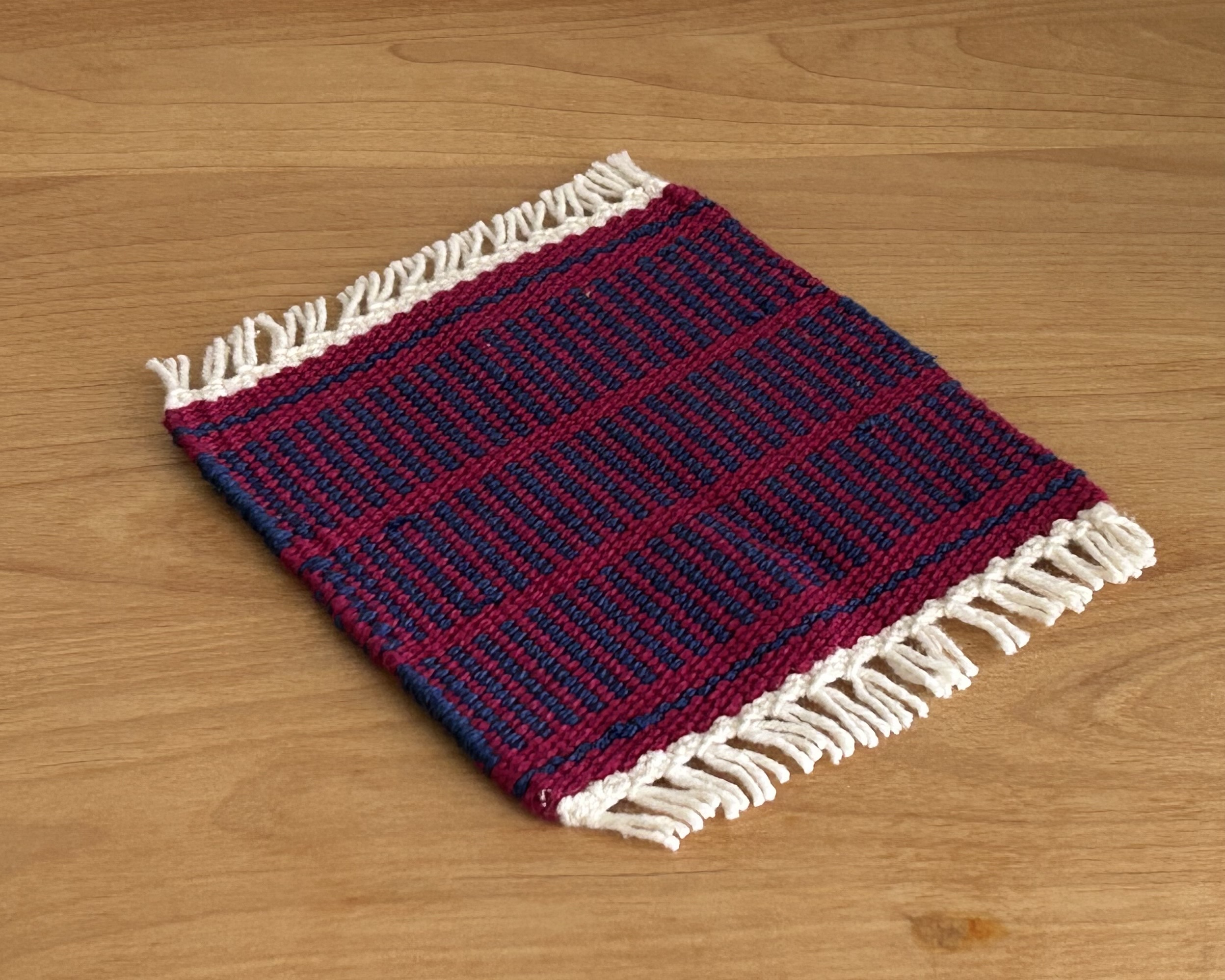 This summer I have been experimenting with different weaving techniques and re-visiting some I haven't used in a while. This approximately 5-inch by 4-3/4-inch (not including fringe) mug rug, was handwoven by me on my small rigid heddle loom, using a weft faced technique that essentially hides the warp yarns except for the fringe. This technique takes more time than a balanced weave due to beating each weft throw with a tapestry shuttle multiple times to completely hide the warp.