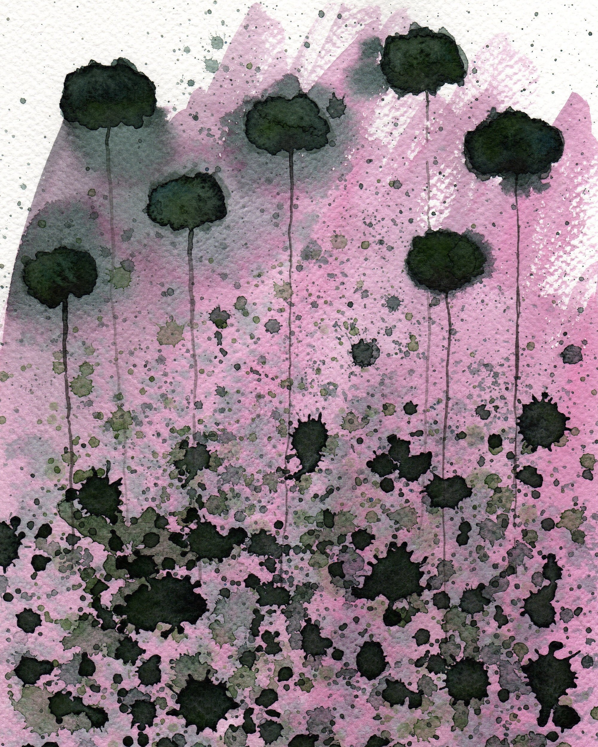 This is a fine art print of my original watercolor painting of flowers. This piece depicts a garden of dark gray abstract poppies against a pink background speckled with gray and black. This is a museum quality piece that has been printed on a professional grade printer in my studio. The colors are vibrant and the details are so fine--it really has the appearance of the original watercolor painting. FAST TURNAROUND I print orders daily and ship your order the next business day to ensure it arrives to you as quickly as possible. BANISH BORING WALLS! Brighten up any room with this gorgeous, museum-quality print of my watercolor painting of flowers. Artwork is a simple, affordable way to change the look of a room and is also the perfect way to complete your renovation project or add an artistic finishing touch to your freshly painted walls. If you’re looking to add vibrant colors, this floral print will fit in perfectly. I also have many color-combinations in my shop to suit many color schemes PopwheelArt.etsy.com ART MAKES A GREAT GIFT This beautiful watercolor print of flowers is the perfect gift for your mom, sister or any friend who likes to decorate with flowers or enjoys gardening. This print makes a wonderful gift for mother’s day, birthday or housewarming. A unique alternative to buying a live flower bouquet. STANDARD SIZES MAKE FRAMING SIMPLE Available in multiple sizes: 5x7, 8x10, 11x14, 14x18, 16x20 (see drop-down menu to make your selection). These are the sizes of readily available store-bought picture frames and mattes. They are ready to pop into your favorite frame with or without a mat. These are also easy sizes for frame shops to work with if you prefer. The sizes listed are the actual dimensions of the paper–they have a small white border to allow for matting. MUSEUM QUALITY MATERIALS : PRINTED BY THE ARTIST I don’t outsource any of my fine art prints on paper. I print each one at a time after you have placed an order. This allows me to do quality checks on every art print as I package it before I send it to you…and I am very picky. These flowers have been printed by me in my art studio using a professional-grade large format printer. This allows me to print at a much higher resolution than a typical home photo printer. It uses 10 cartridges of highly pigmented inks. The finished print has a lightfastness rating of 200 years as long as it is kept out of direct sunlight. This image is printed on 260gsm thick and velvety fine art paper that is 100% cotton rag. This is a specialty printing paper and is archival. I selected this particular paper because it is a fresh white that allows the colors to pop and I love the heavy weight and subtle textured matte finish. It has the vibrancy and fine detail even up close. This is a true museum quality art print. Each print is hand signed on the back and initialed on the front. I package each print in a clear plastic sleeve with a chipboard backing. Your order is shipped carefully and secure in a non-bendy photo mailer. U.S. Shipments: I ship all of my prints flat and not rolled up in a tube. International Shipments: for prints that are 14x18 and up are carefully shipped in a tube in order to keep shipping costs down because this is considered an oversized package. I am more than happy to ship flat for an additional fee. Contact me for further information.