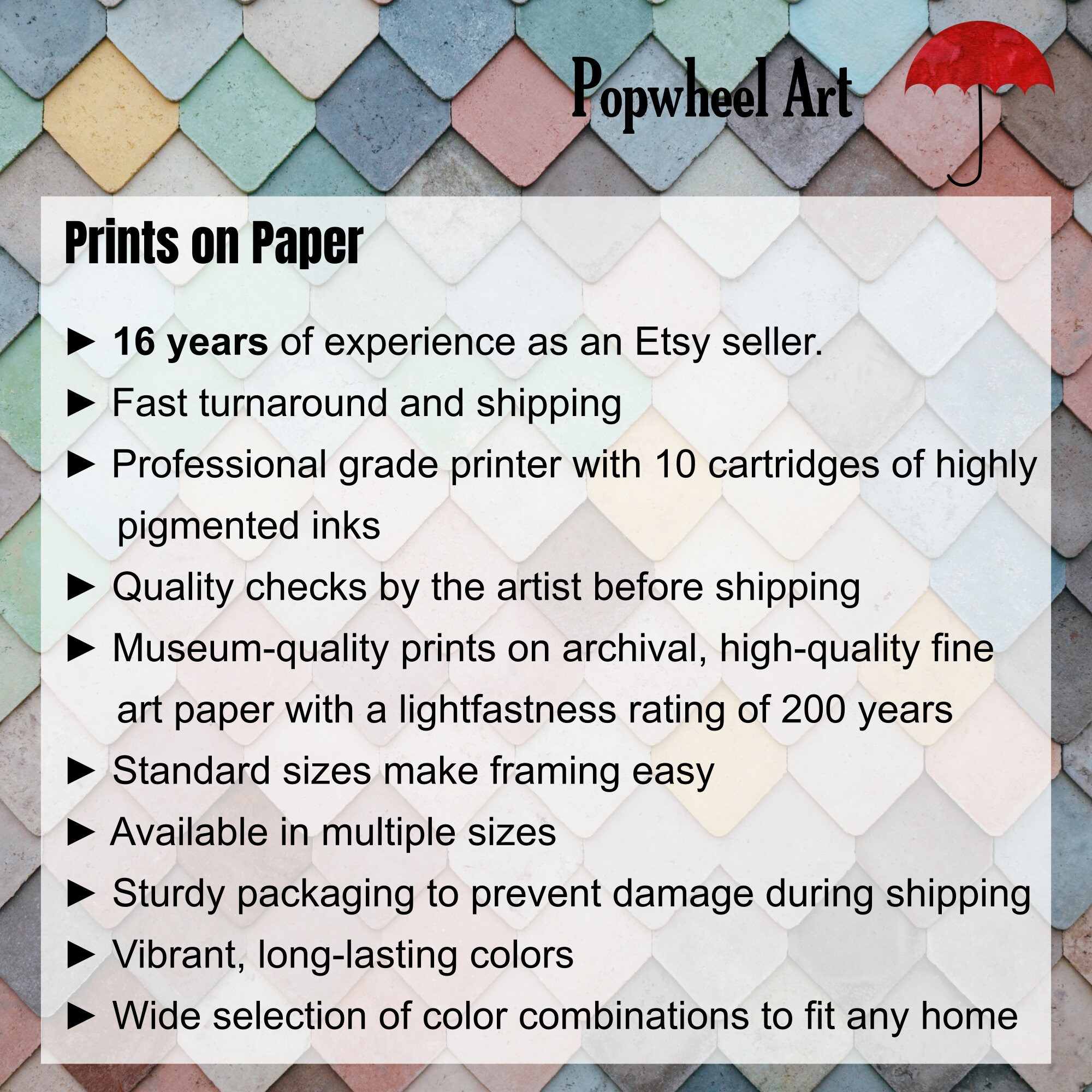 Hi there! My name is Jennifer Comstock and I’m the artist behind Popwheel Art. I’ve been selling my artwork online continuously since 2006. That’s about 18 years perfecting my craft and providing my customers with bold and colorful watercolor flowers to brighten their space.