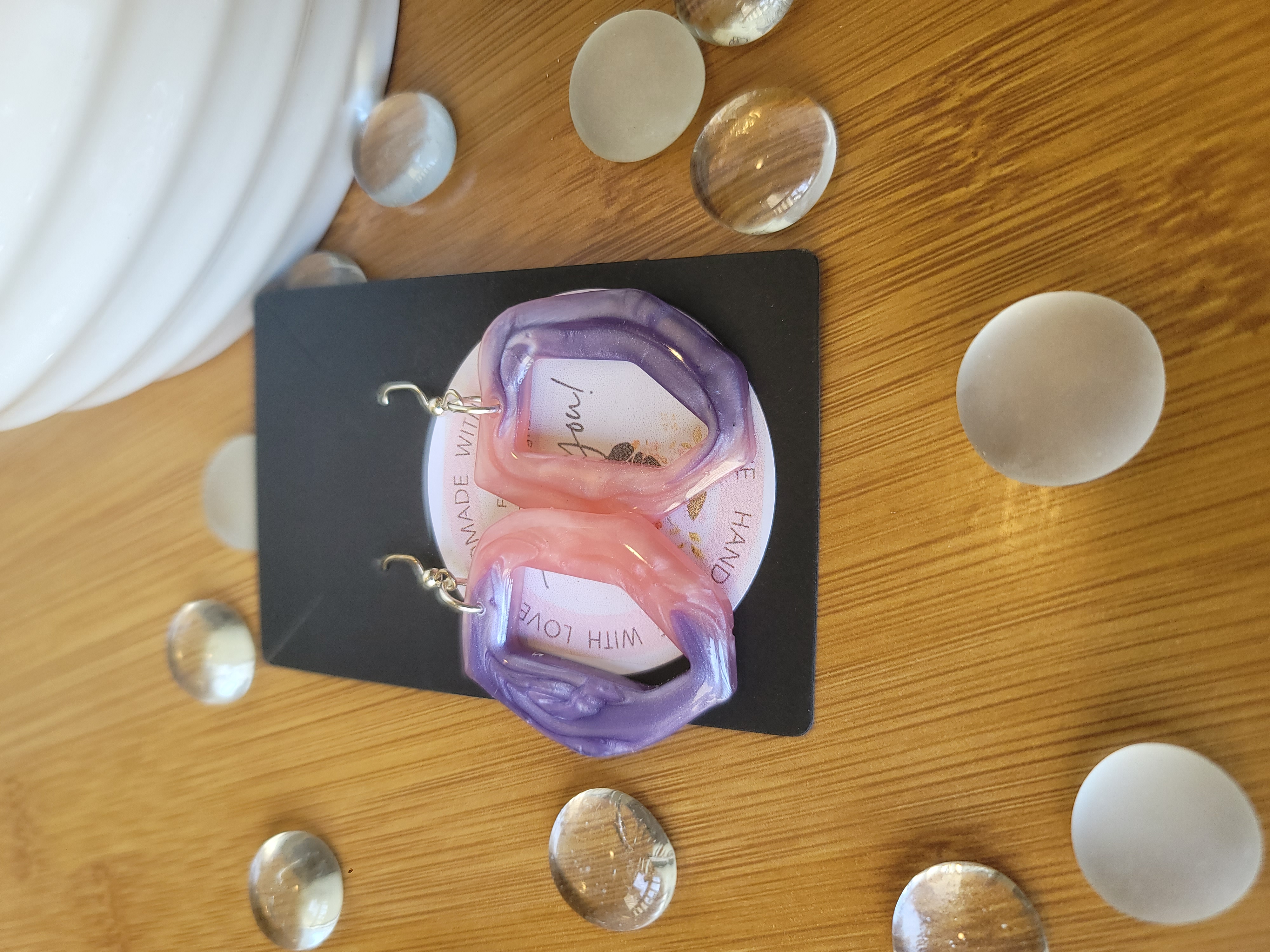 Add a pop of color to your look with these stunning pink and purple resin earrings! Each pair is handcrafted with love, featuring a unique blend of vibrant hues swirled together to create a mesmerizing effect. These earrings are approximately 2 inches long and beautifully shaped into a modern hexagon, making them the perfect statement piece for any outfit. Lightweight and eye-catching, they’re sure to become a favorite in your jewelry collection!