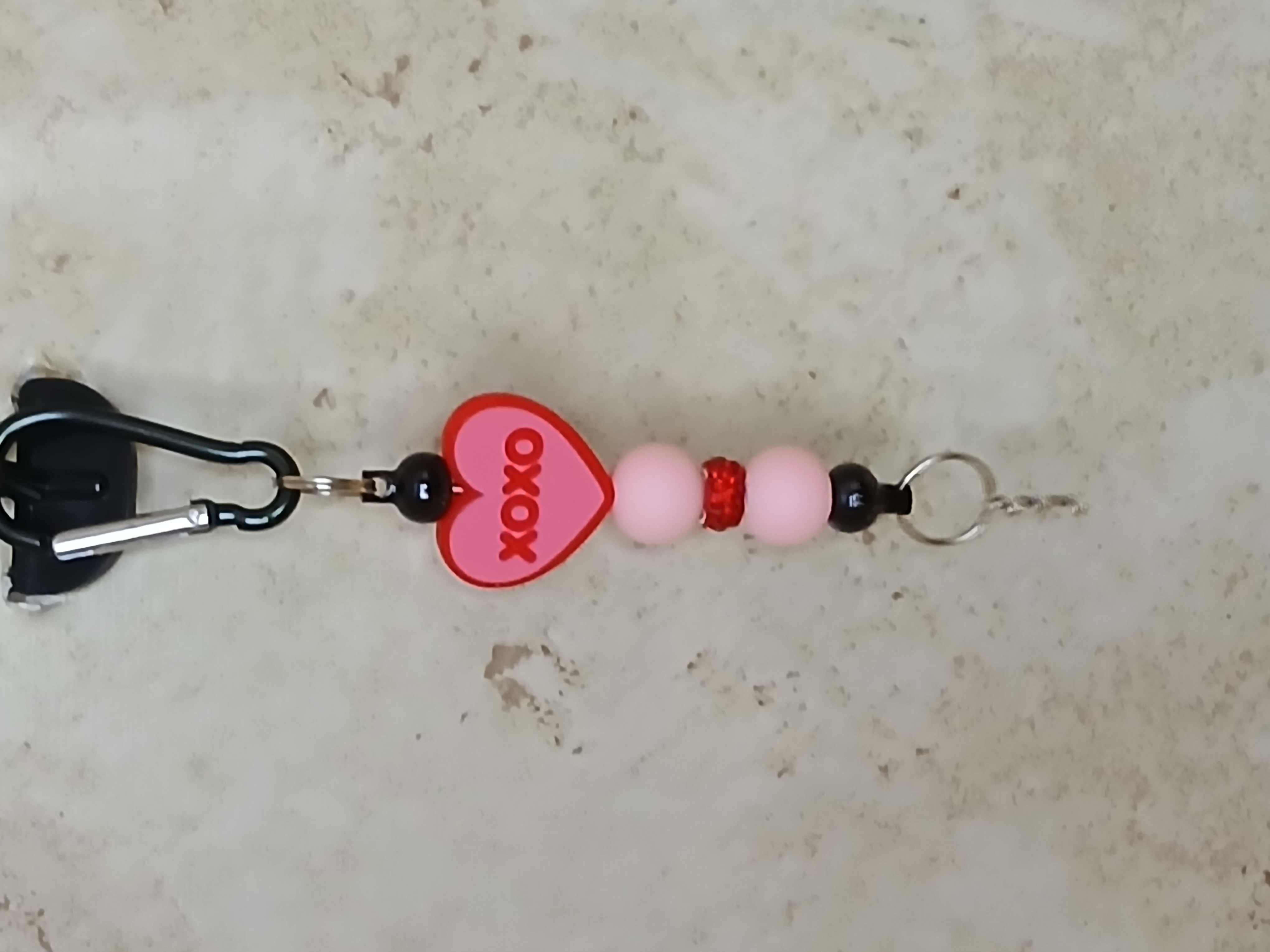 Do you want your kisses to last well this pink and red heart shaped key ring with xoxo and large Carabiner clip will just do that. Your choice to personalize with a tassel or initial