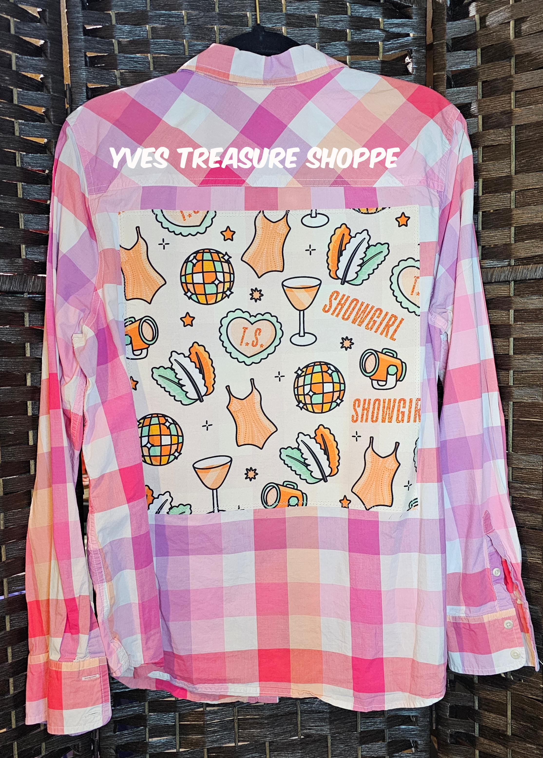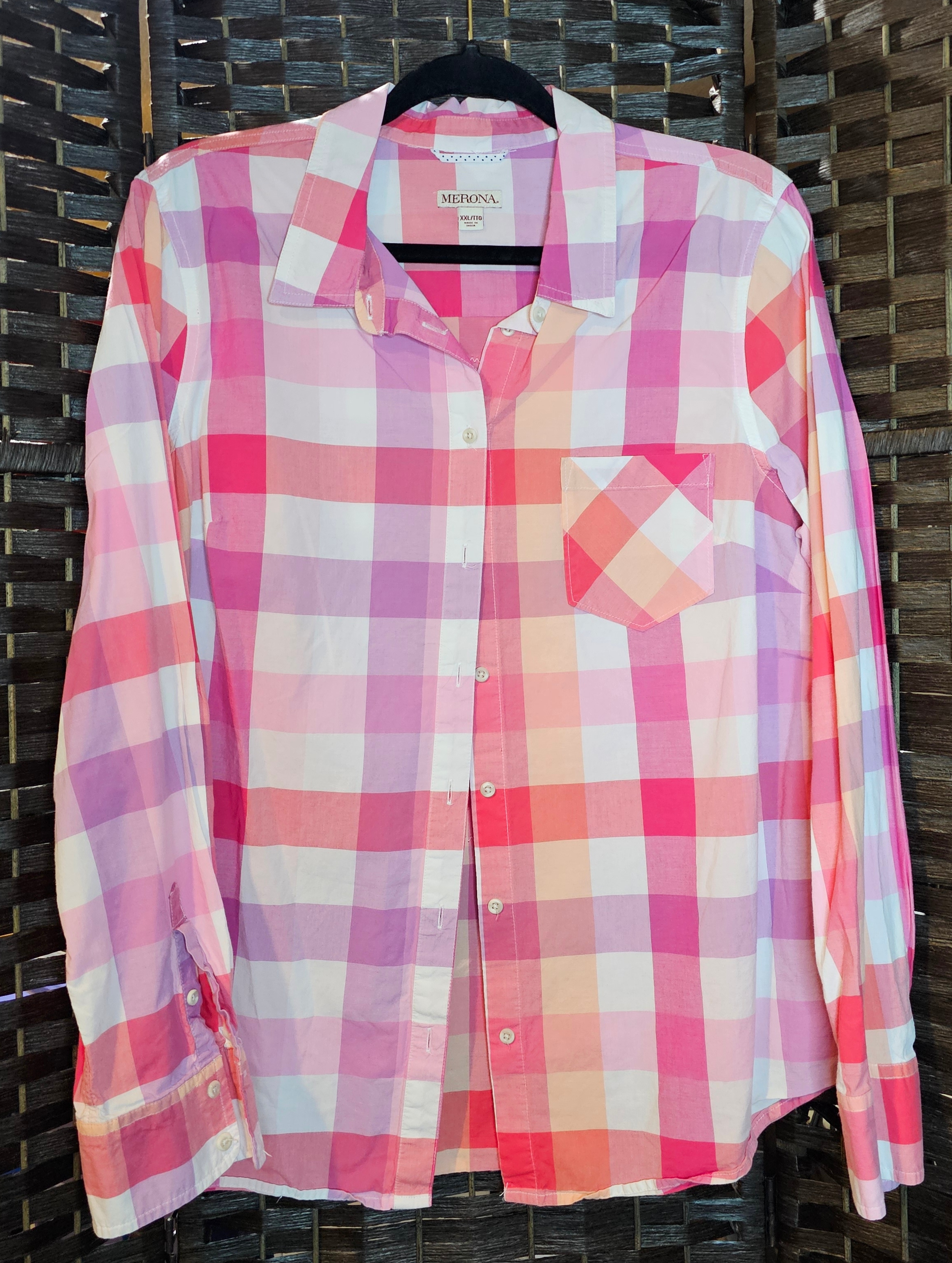 This is an Upcycled Merona XXL Shirt. 22.5 inches across pit to pit. 27.5 inches long from top of shoulder to bottom of shirt. Embellished on back with a fabric Panel.