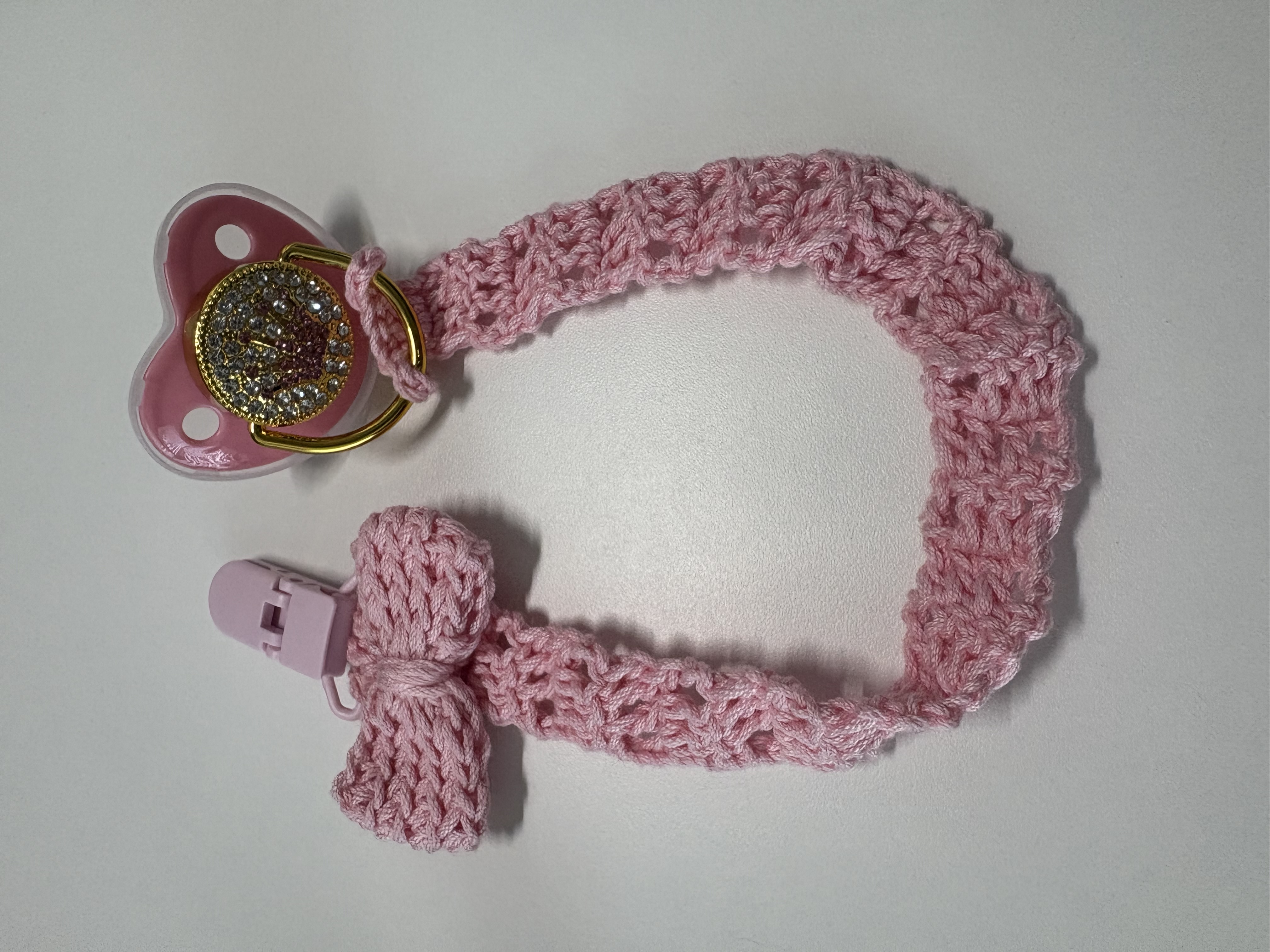 Handmade-pacifier clip holder created using 100% cotton yarn. Soft to a baby's touch.