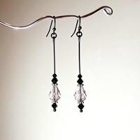 Beautiful pink crystal dangle drop earring reminiscent of a genie's bottle. A pink faceted rondelle bead forms the base of the earring and a black glass bugle bead completes the neck of the bottle. These earrings are fun and spirited.