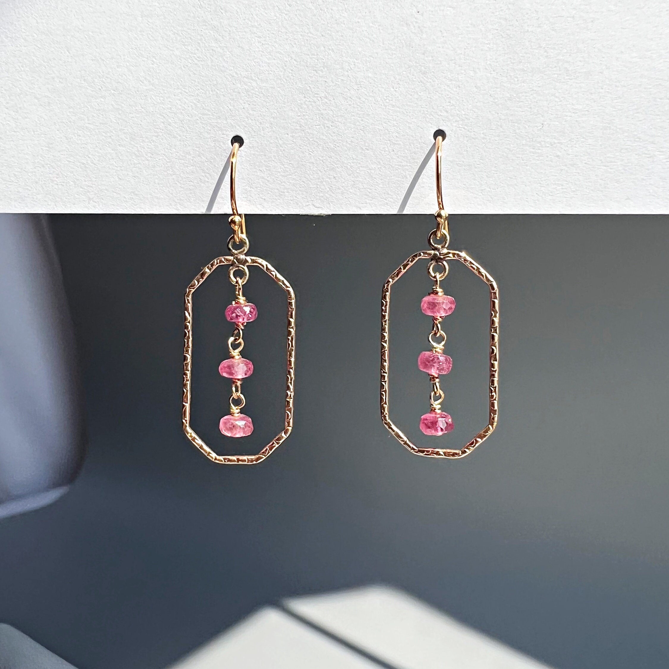 These earrings are perfect for when you want to add understated glamour to your outfit. The faceted Pink Tourmaline roundels, with their iridescent play of colors, delicately catch the light, bringing any outfit that perfect hint of sophistication. Each stone on these feminine earrings is meticulously hand-wrapped in either 14K Gold-Filled or Sterling Silver Wire.