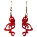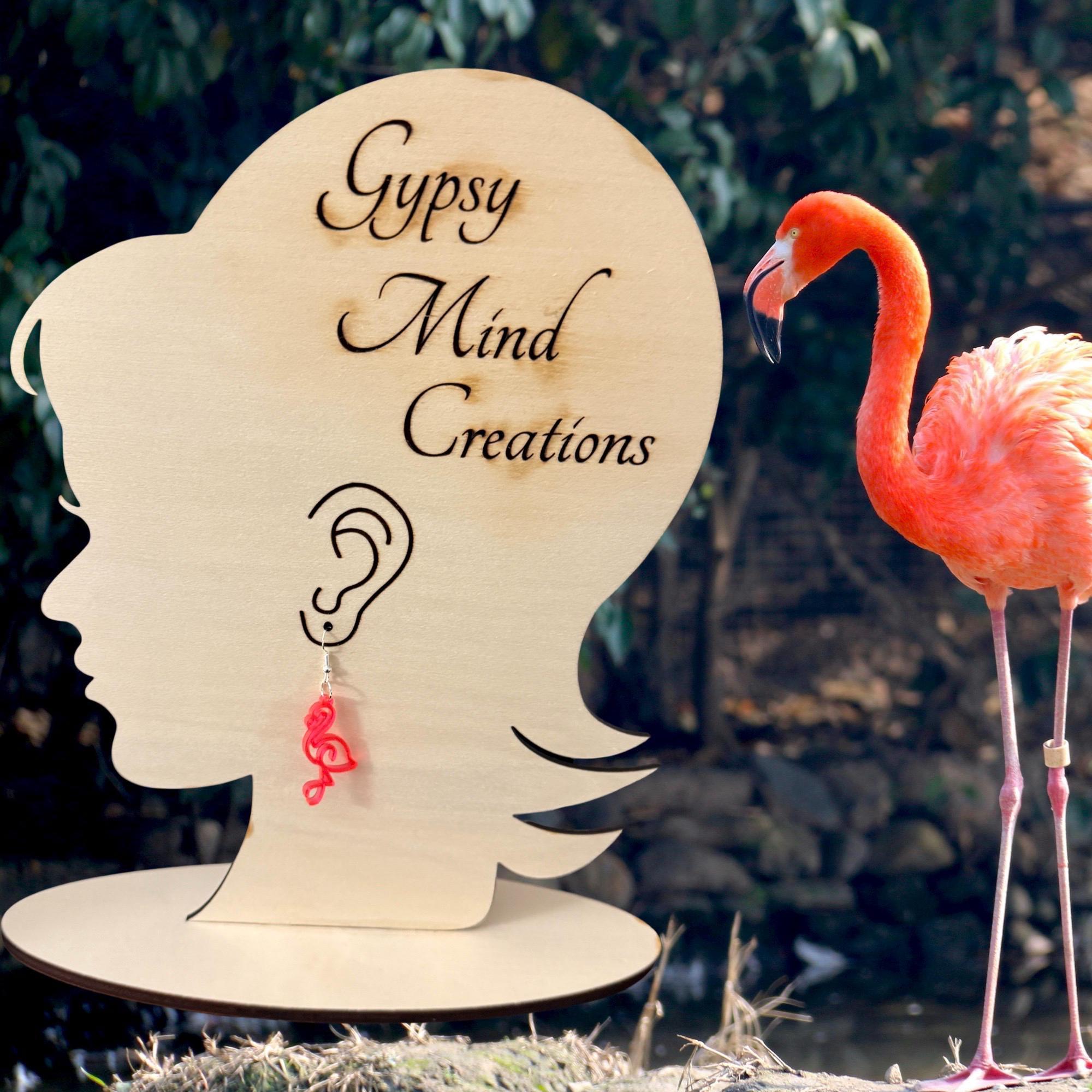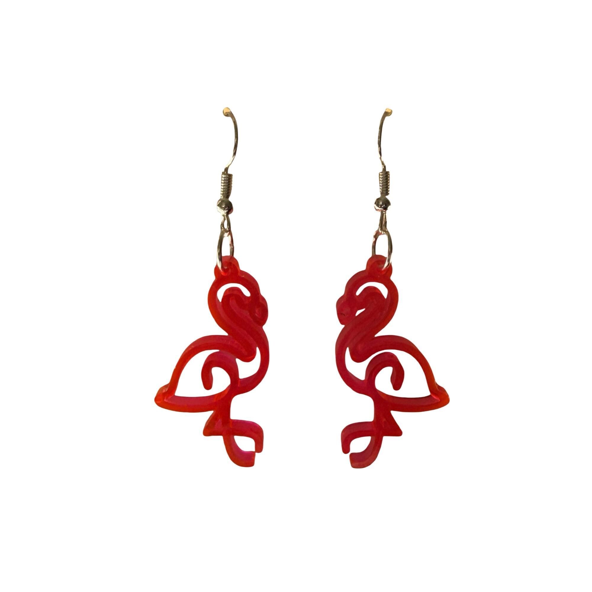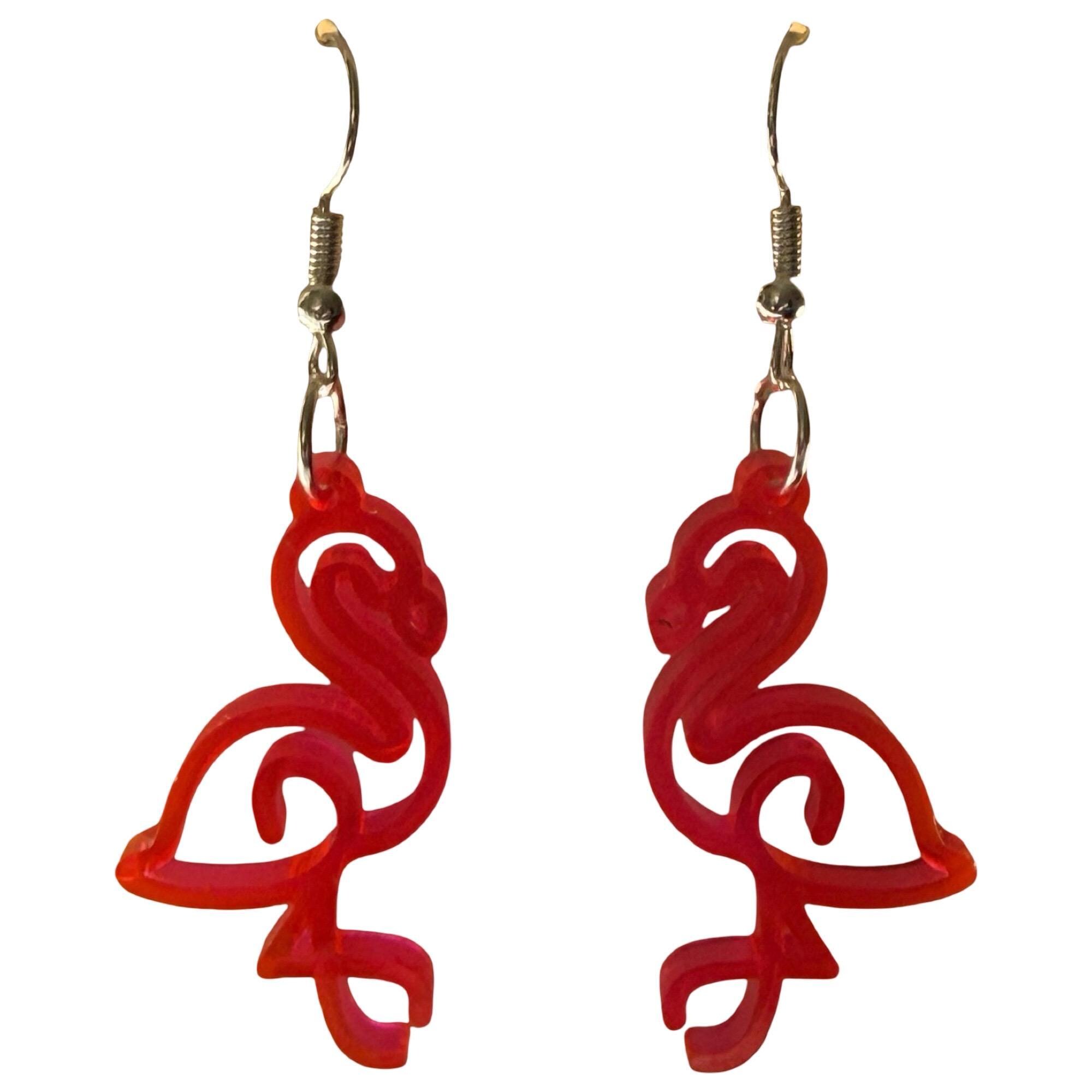 These are a pair of flamingo laser cut lightweight acrylic earrings. They are made from 1/8 in thick medium fluorescent pink acrylic. They are on ear wires. All metal components are silver, gold, or brass plated, or black alloy, nickel & lead free, and hypoallergenic. They are approx. 1.5" long. Backs not included but available upon request.