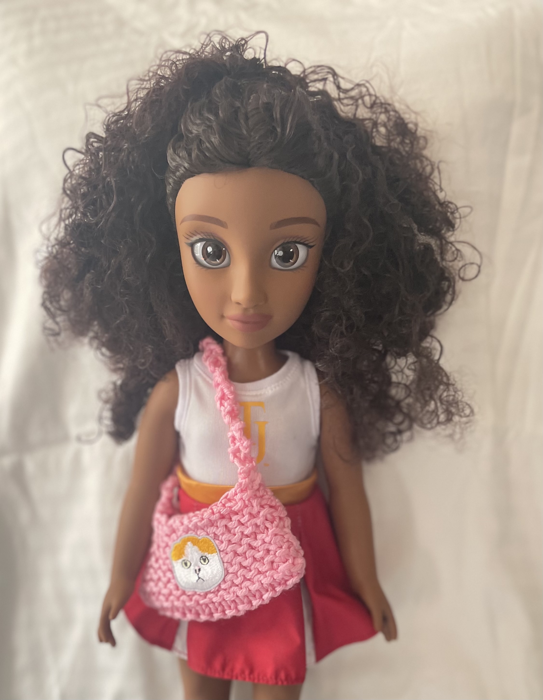 Who doesn’t love kittens! This pink hand knit bag fits any 18” doll and comes with a kitten/cat appliqué. Super adorable! Bag measures 4.25”x2.25” (4.25”x5.25” with strap.). Time to think about stocking stuffers for the holidays❣️