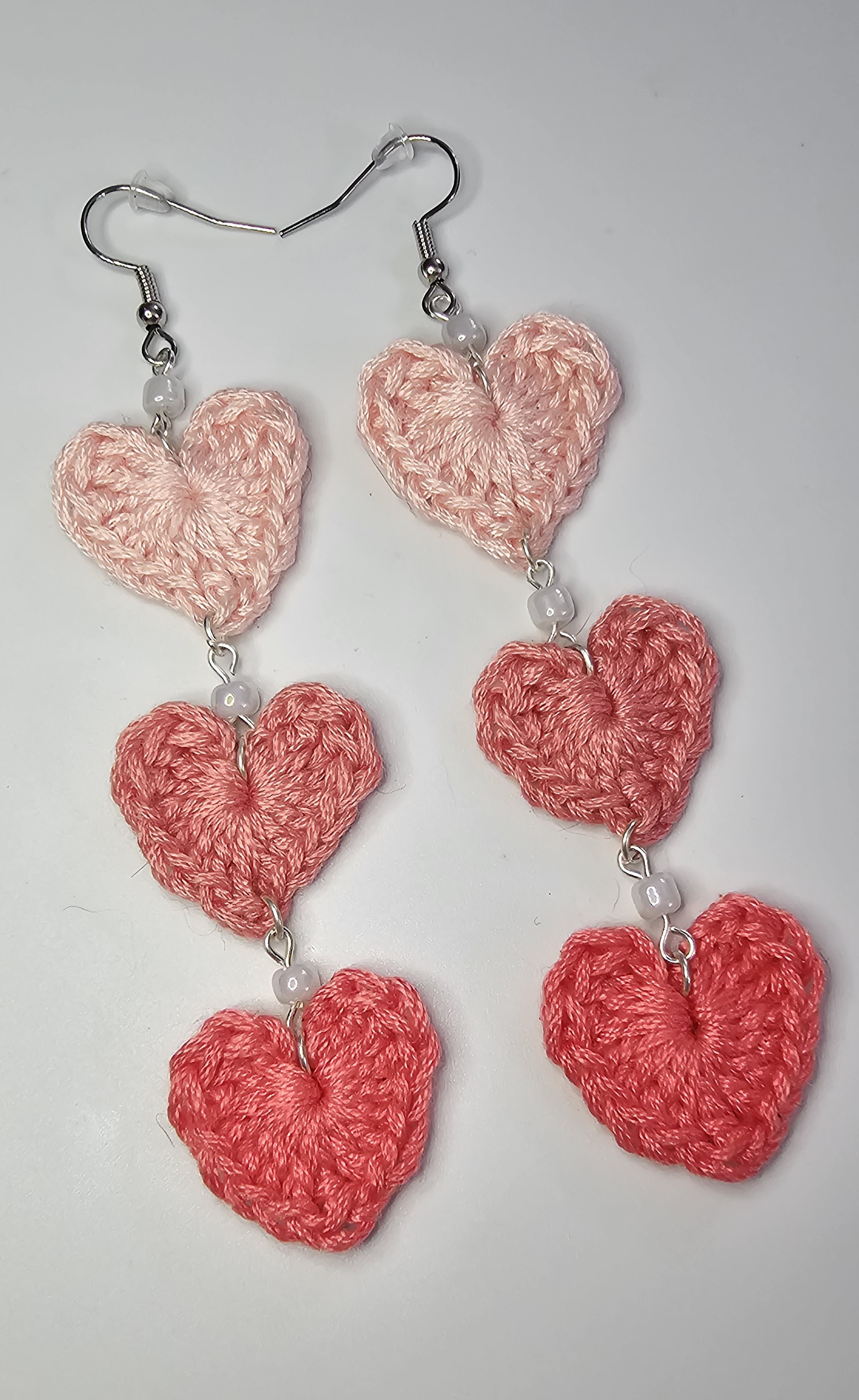 The hearts are lovingly hand crocheted with embroidery floss, then assembled together with beautiful beads for added pizzazz using jump rings.