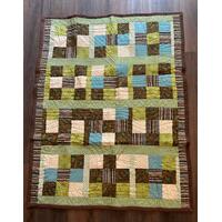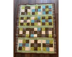 The first step is cutting out the squares or rectangles from the fabric. This step takes several hours and is important because cutting the pieces accurately makes the quilt come together more evenly. The next step is sewing those fabric pieces together to create the top of the quilt. This can take from five to ten hours depending on the complexity of the quilt top. Once the quilt top is created and all of the seams are pressed flat, the step that actually makes it quilting begins. This step is the most difficult because it requires lining up the quilt top, the batting, and the back of the quilt. The three layers must be straight and taut so that the fabric won't move when it is being sewn together. I use close to 100 safety pins to pin together these three layers! Next, the three layers are sewn together. This is quilting. It can be time consuming because the seams have to be close enough together that the batting will not bunch up when the quilt is washed. I generally quilt in straight lines so that the seams do not distract from the design of the quilt. Finally, the edges of the quilt are trimmed perfectly straight and the binding is put on. Sewing the binding to the back of the quilt is usually done by hand so this step can also be quite time consuming.