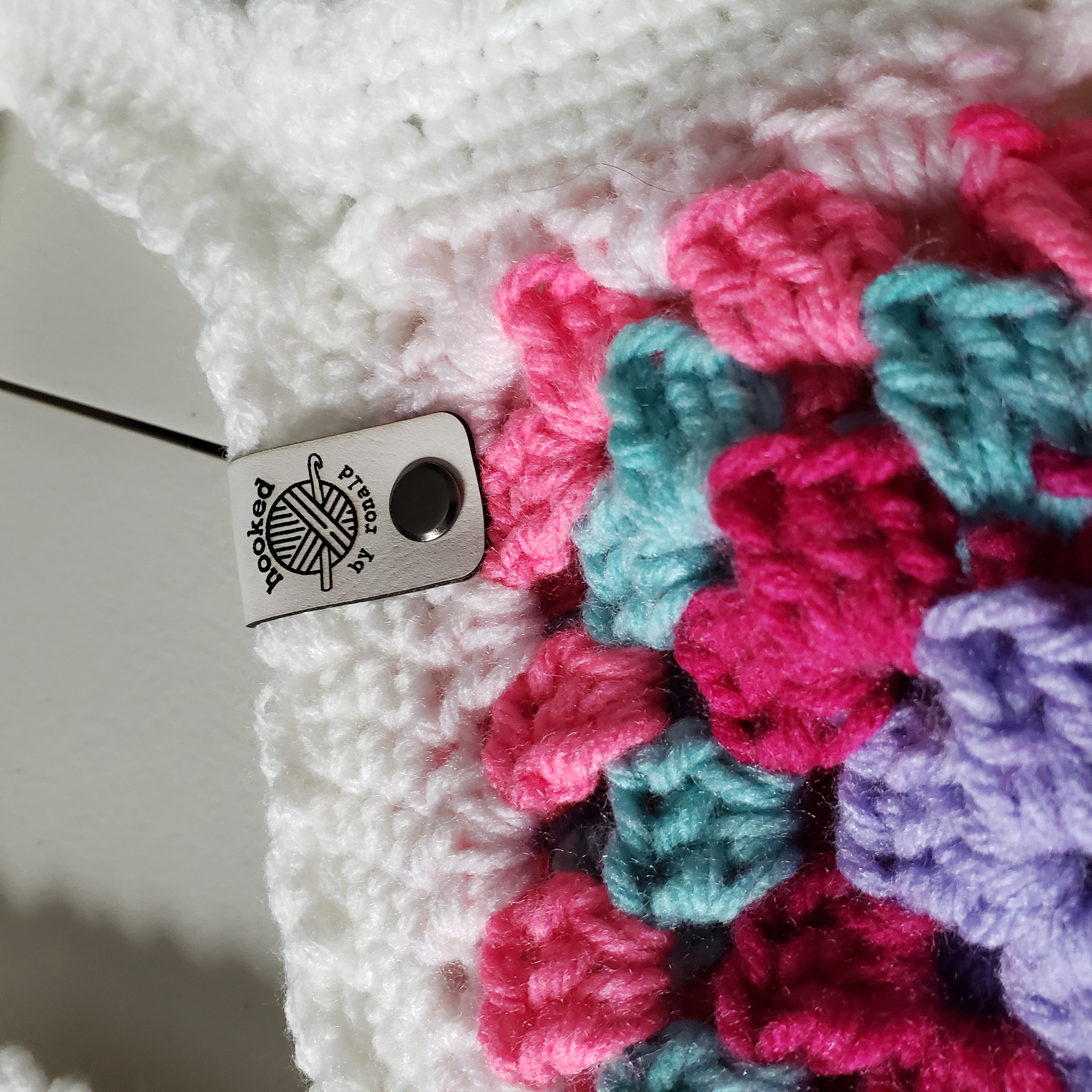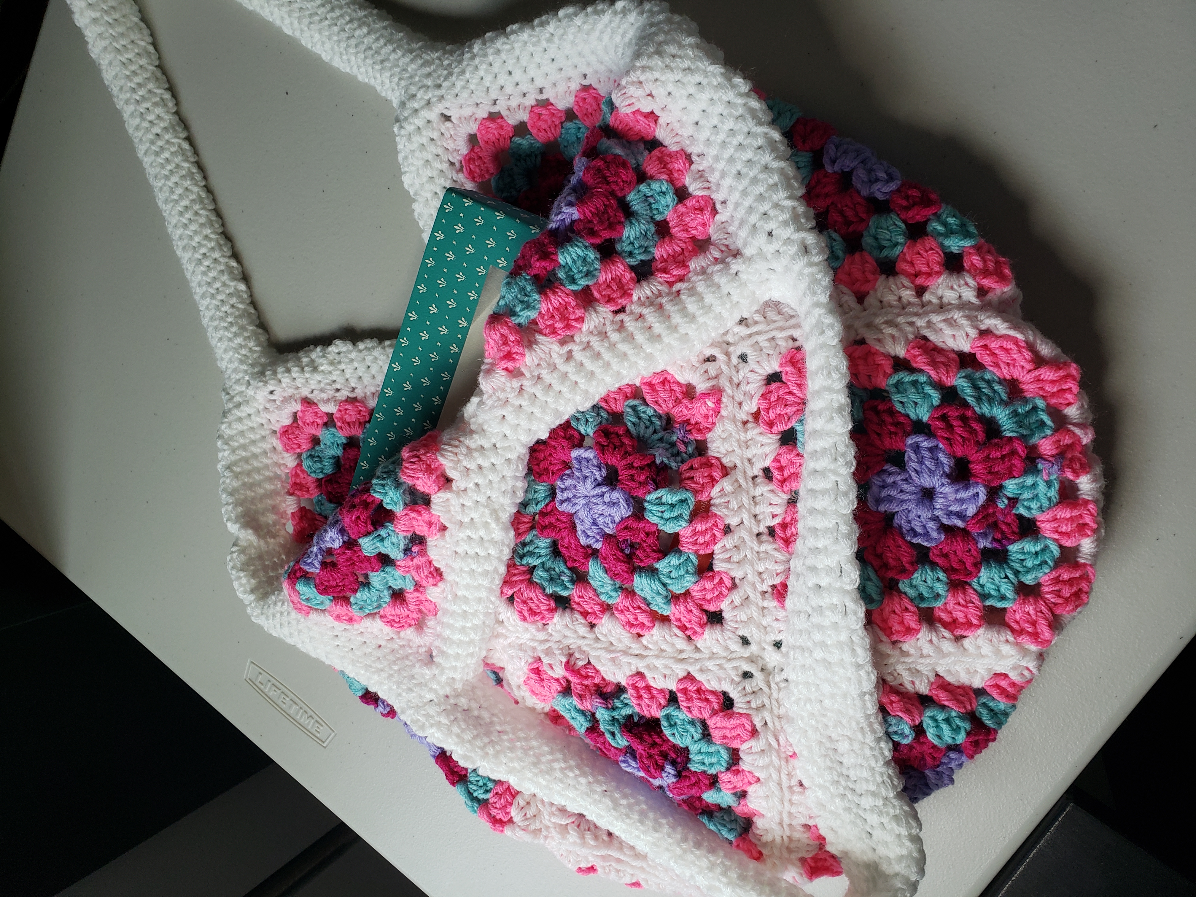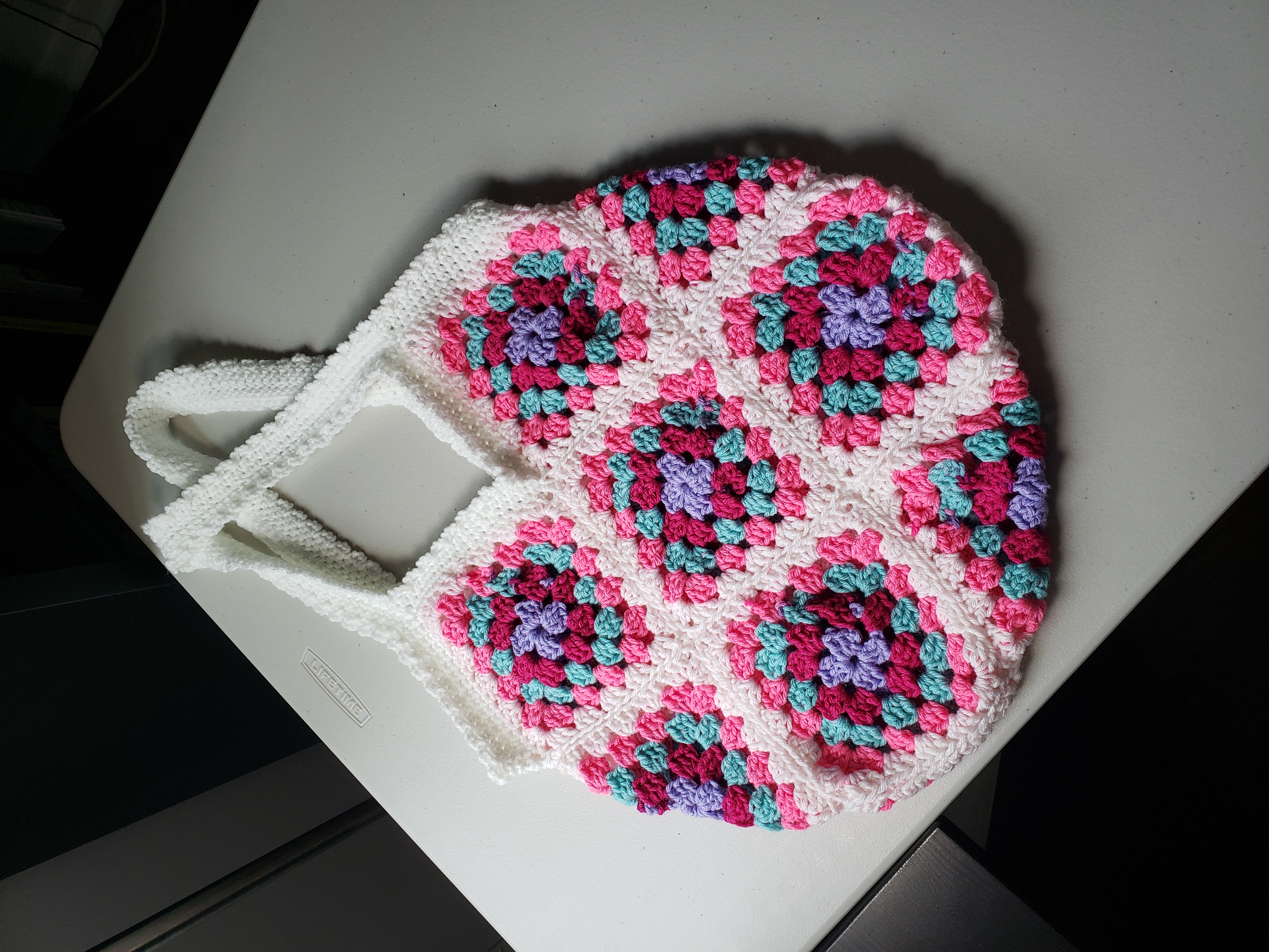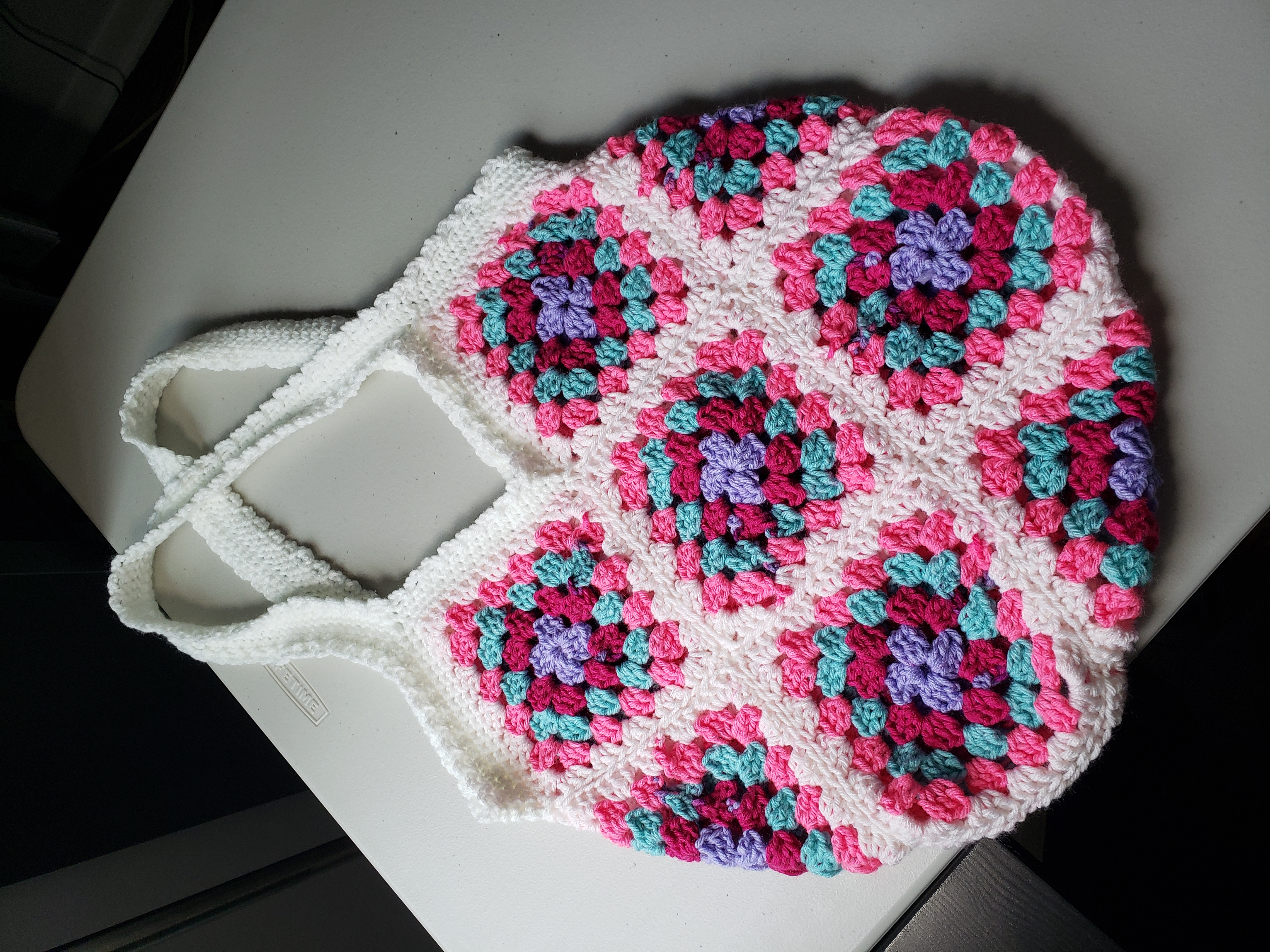 This is my handmade crochet tote bag. The bag is unlined and made with 100% acrylic yarn. The bag comes in many colorways, but this one is made with a yarn called All In One Granny Square in the colorway Pink Punch. Includes faux leather Hooked By Ronald tag.