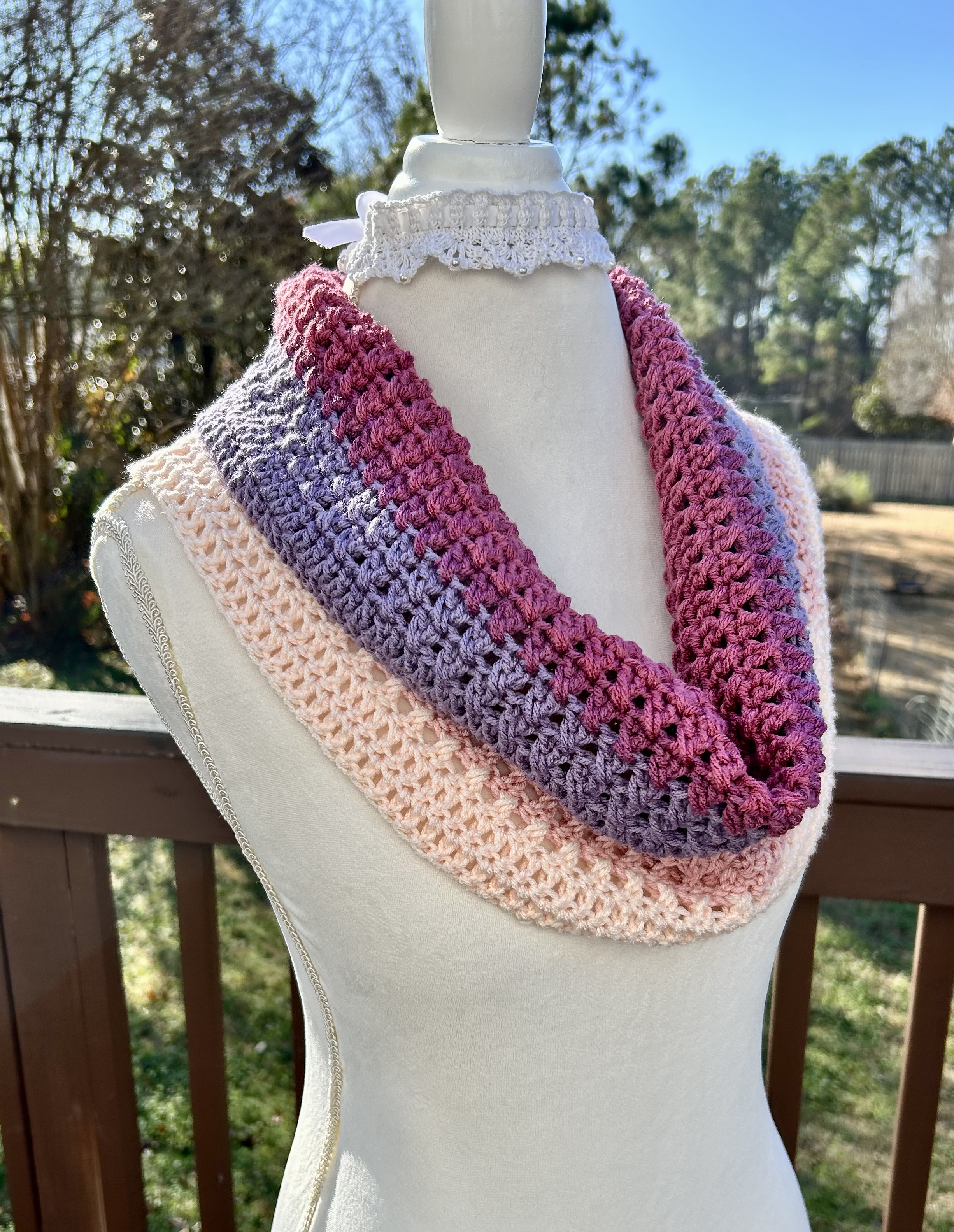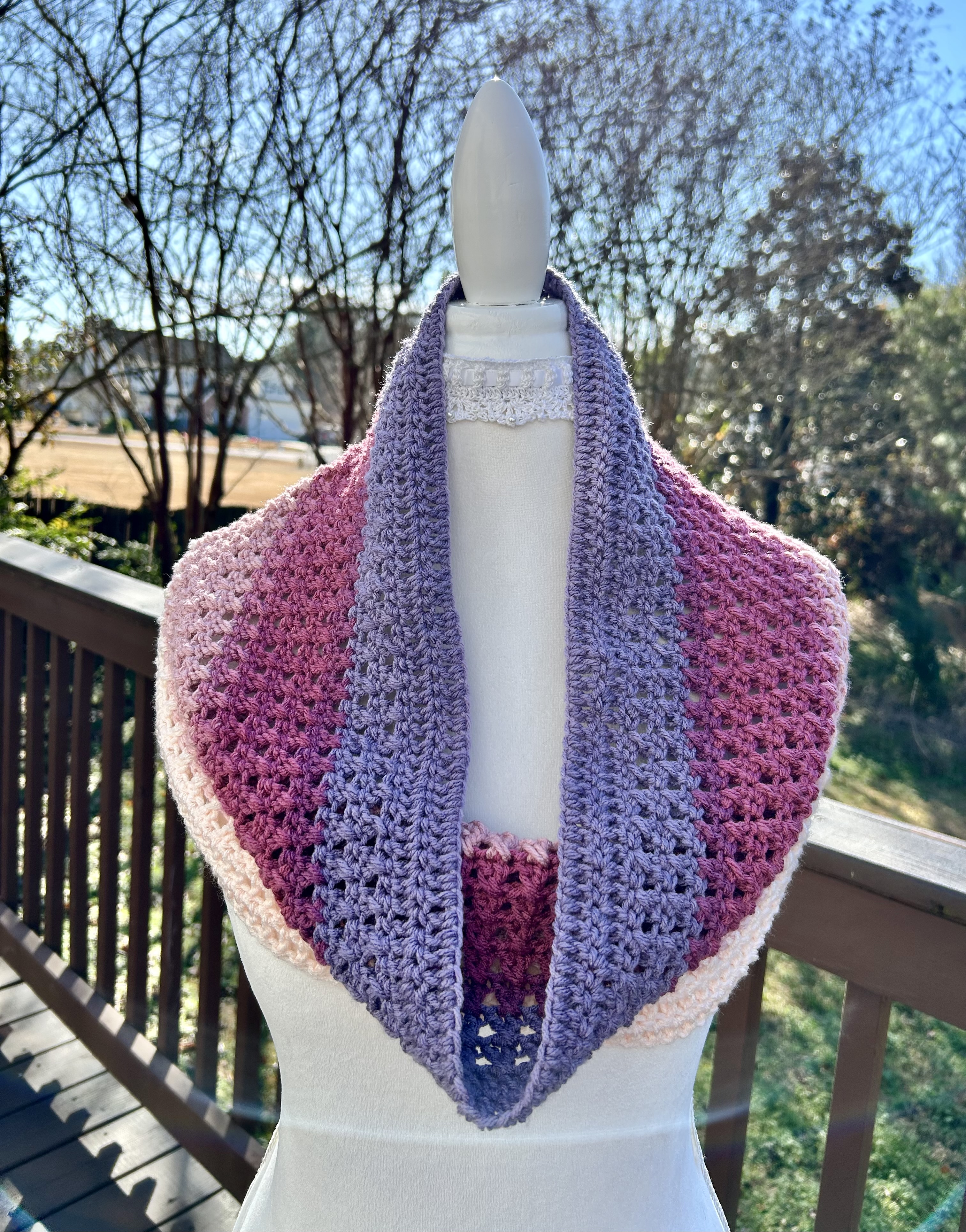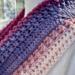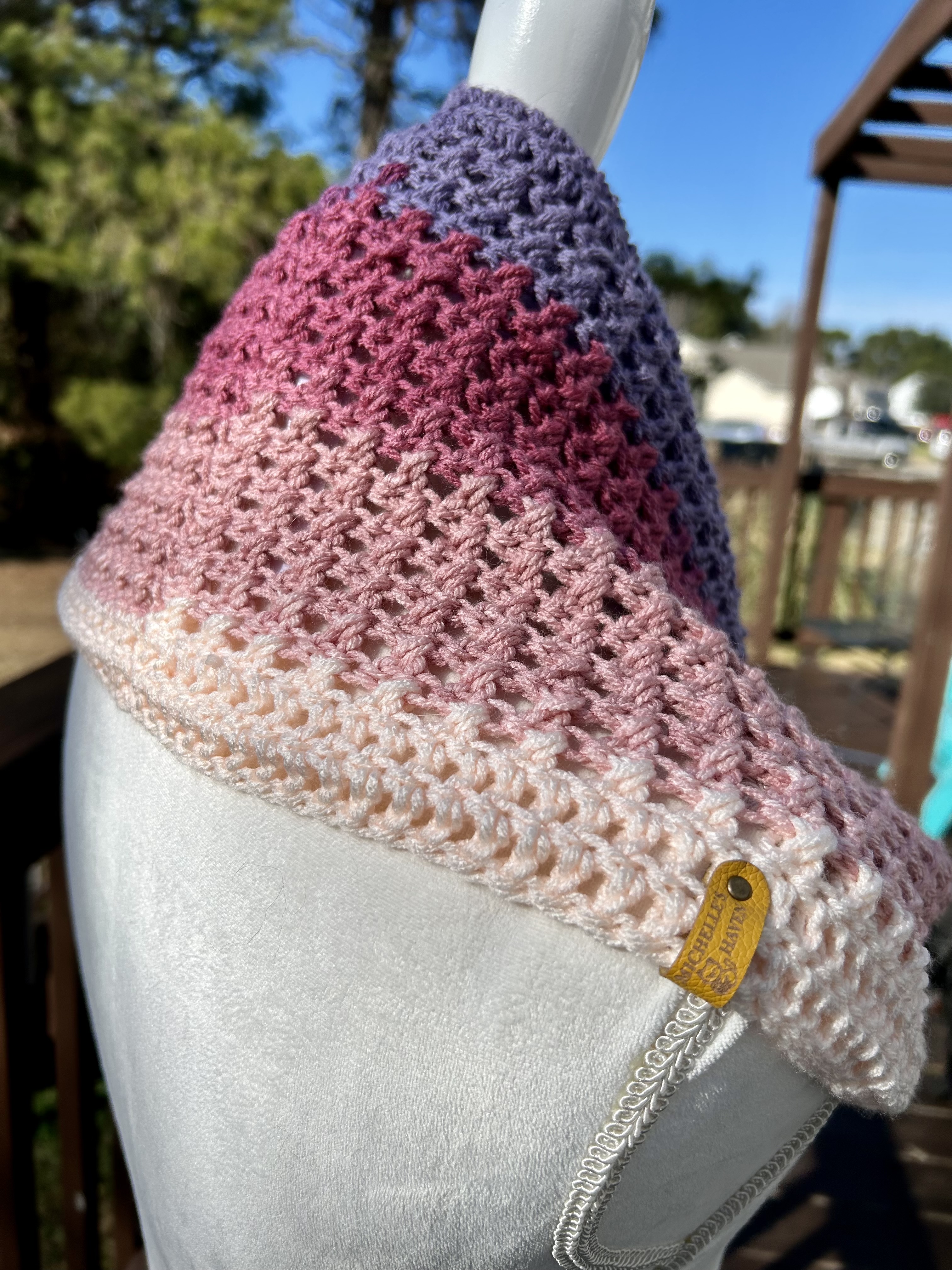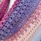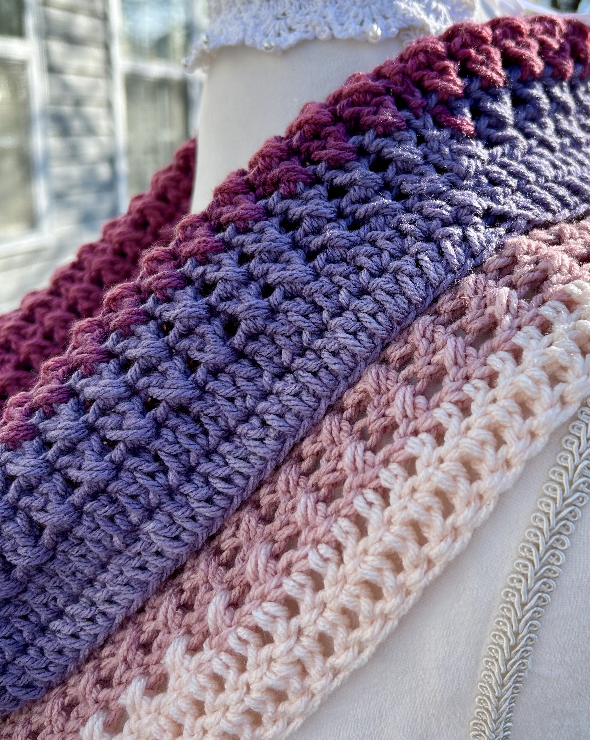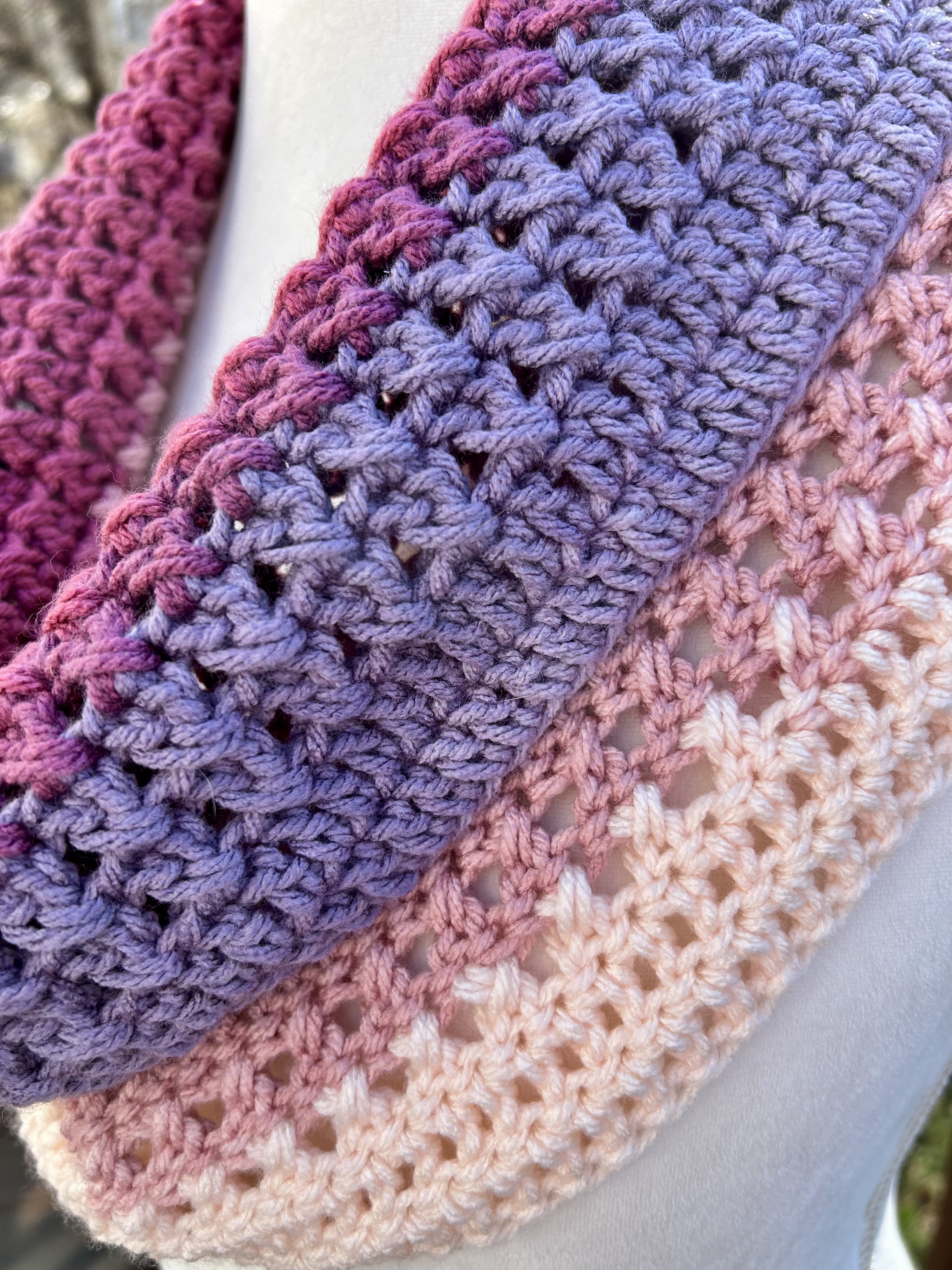 Hand crocheted in double crocheted criss crossed clusters for added depth, warmth and texture. The yarn is Hobby Lobby’s Yarn Bee Sugarwheel in the colorway Gimme Cobbler, an acrylic ombre yarn in shades of pink and purple.