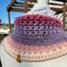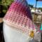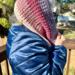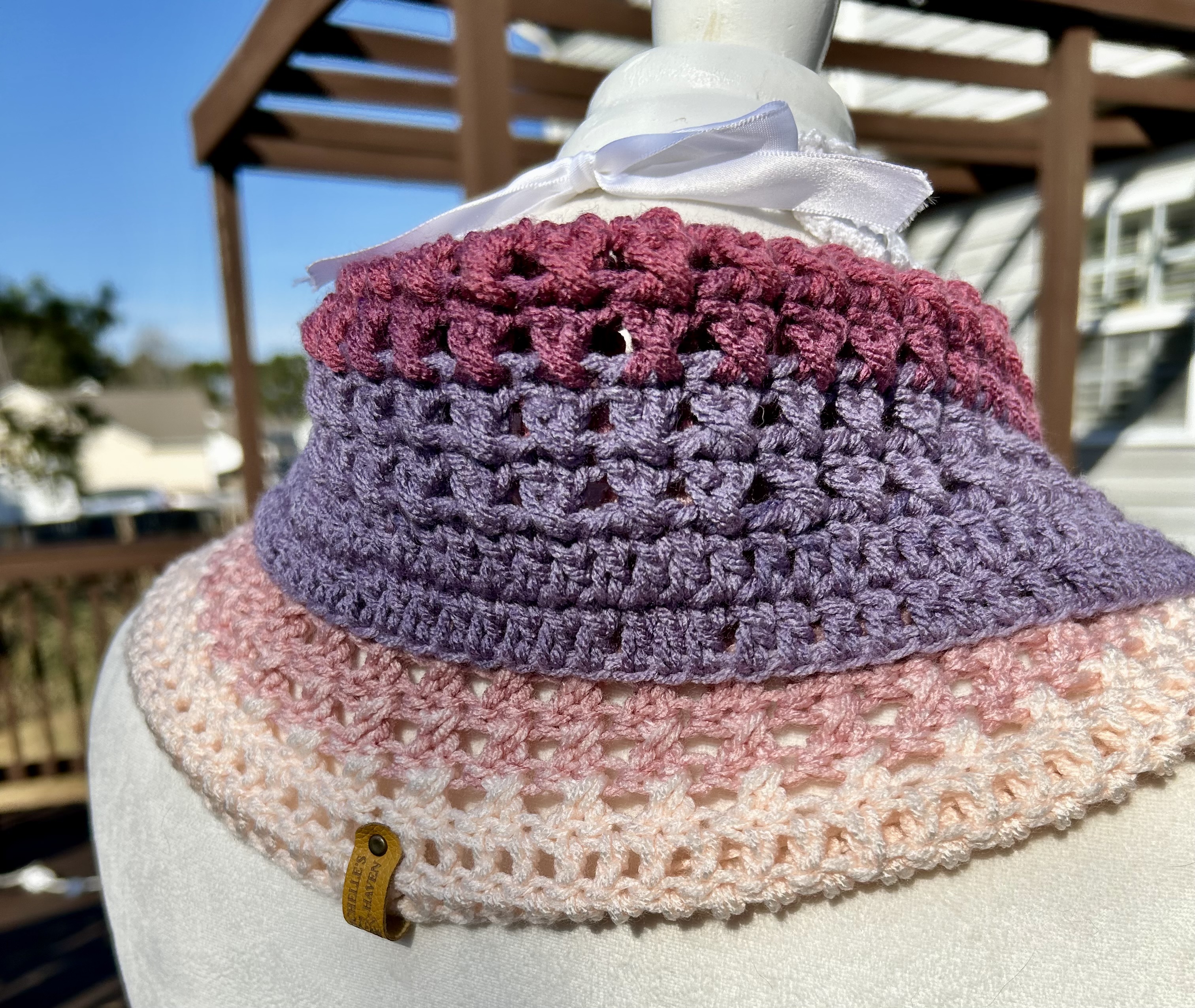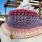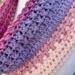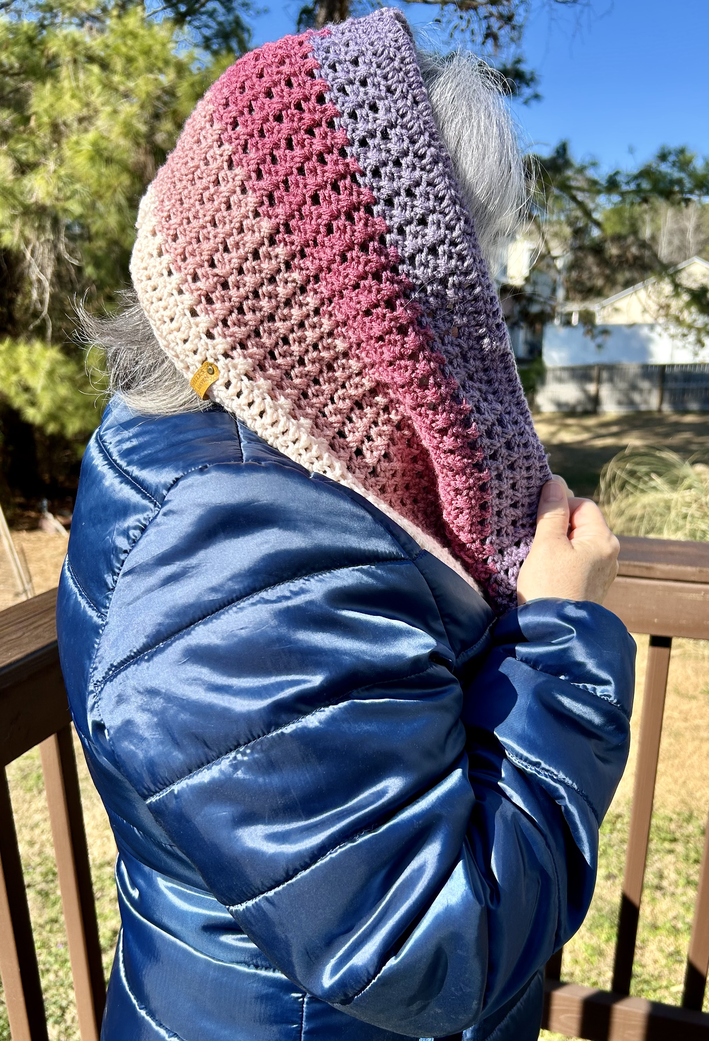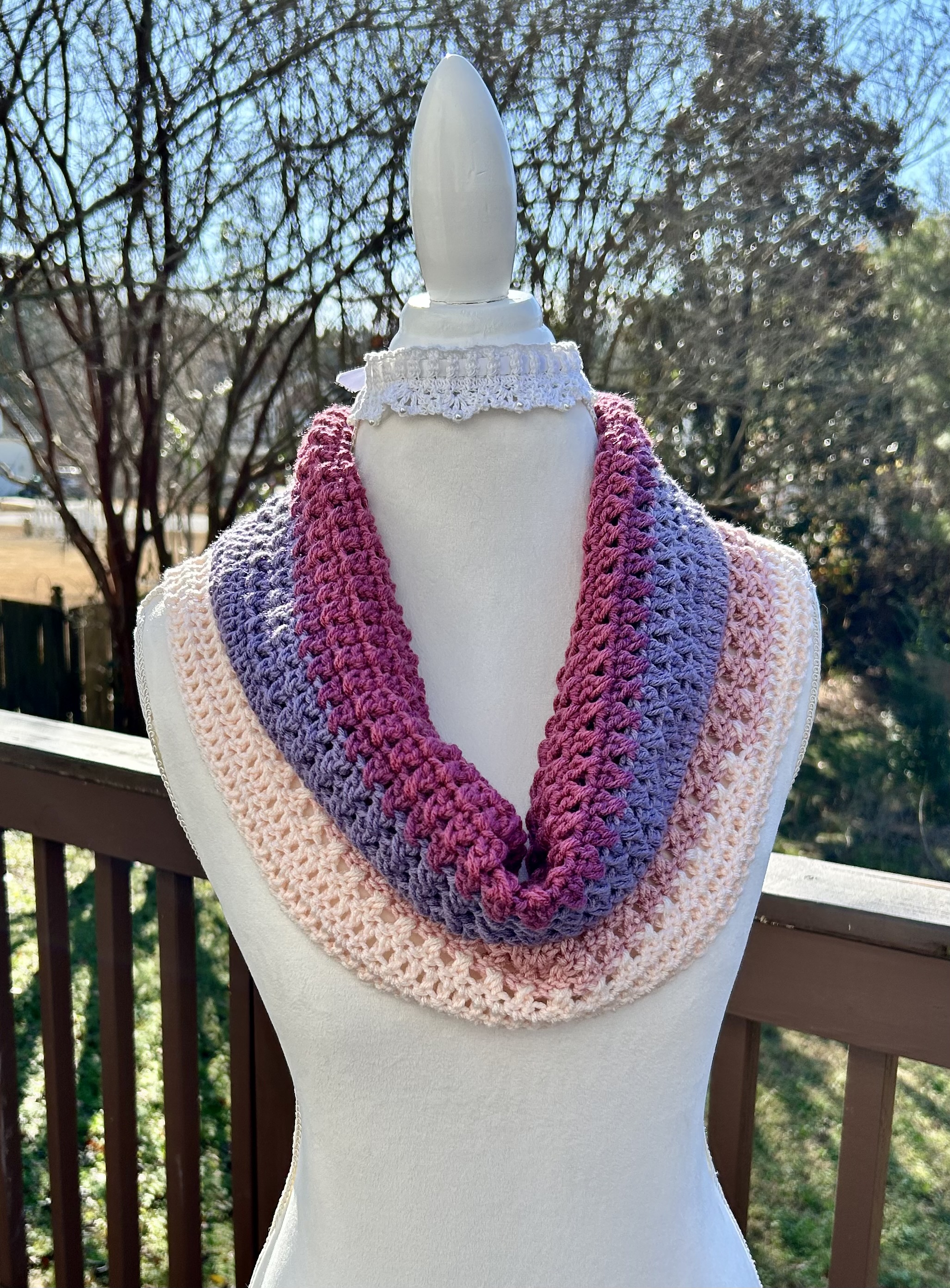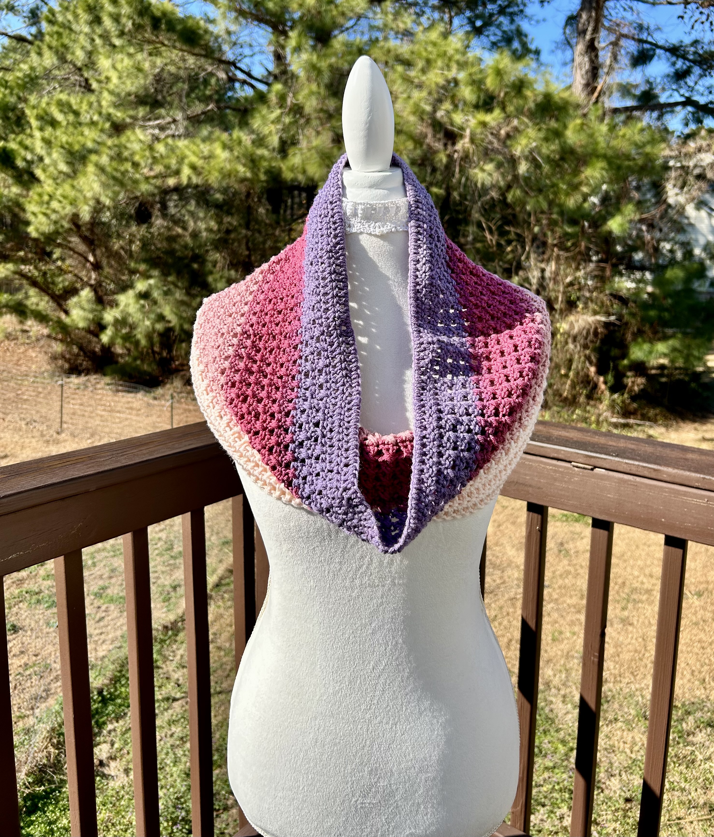 Hand crocheted in double crocheted criss crossed clusters for added depth, warmth and texture. The yarn is Hobby Lobby’s Yarn Bee Sugarwheel in the colorway Gimme Cobbler, an acrylic ombre yarn in shades of pink and purple.