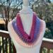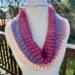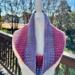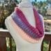 Hand crocheted cowl made with Hobby Lobby’s Yarn Bee Sugarwheel in the colorway Gimme Cobbler, an acrylic ombre yarn in shades of pink and purple. This yarn is soft, easy to care for. The stitch is a repeat of crossed double crochets to add depth, warmth and texture to the beautiful colors of this yarn. It will make a great fall/winter fashion accessory for a teenage girl or woman. Size should fit most adult women.