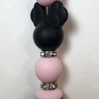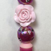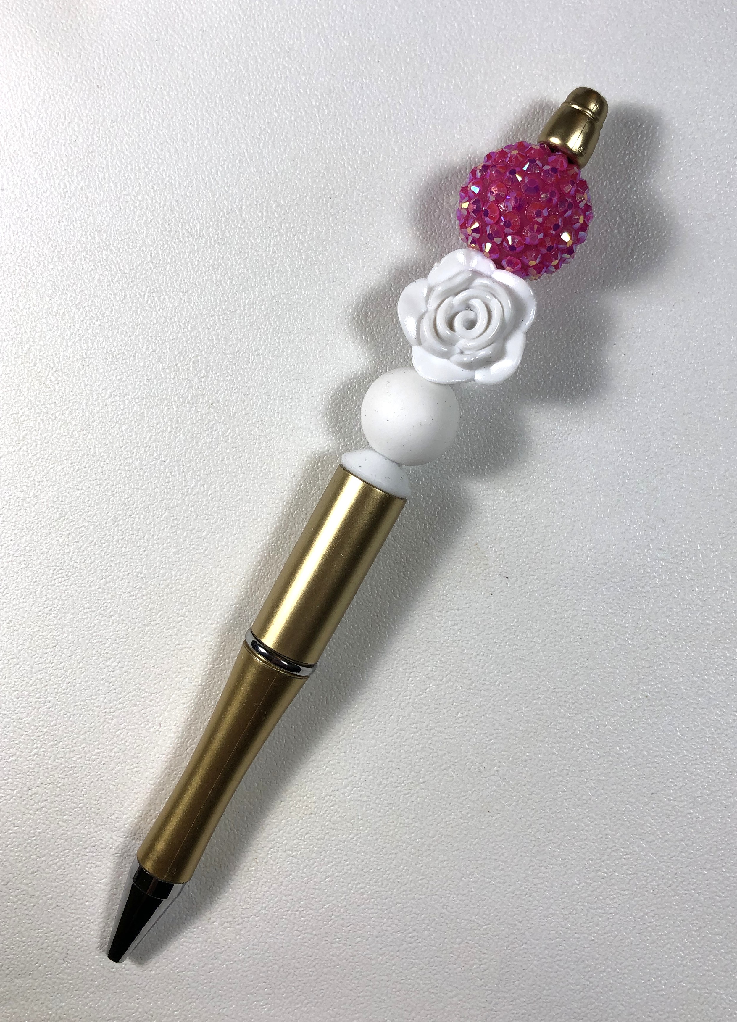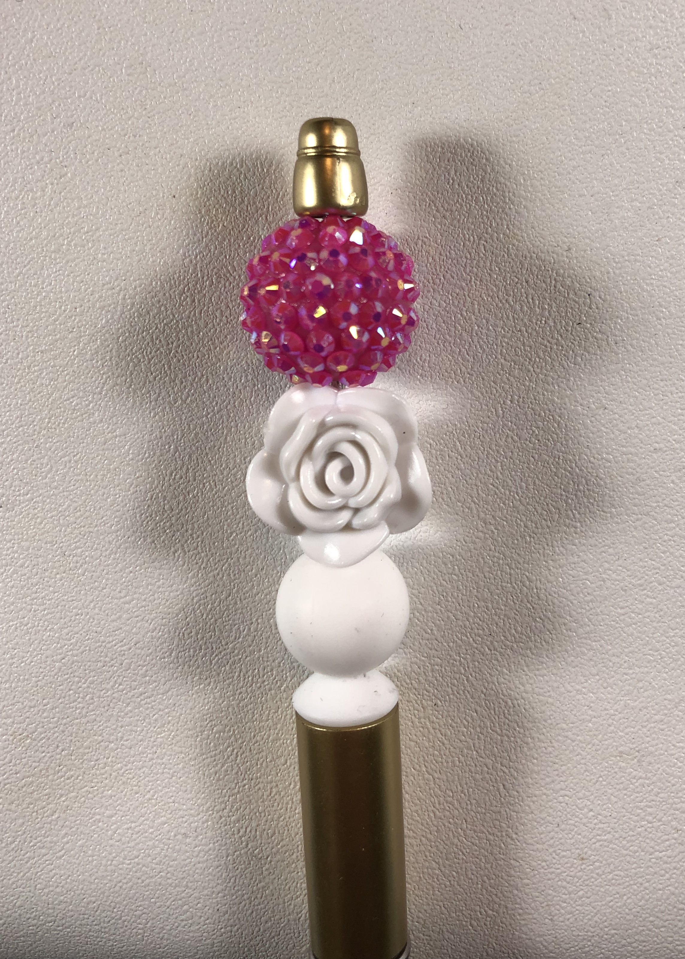 The Focal Bead is a White Plastic Rose Bead and a Pink Sparkle Bubblegum Bead with white accent Silicone Beads and a gold Pen Perfect for Valentine's Day, Mother's Day, a Birthday or any occasion